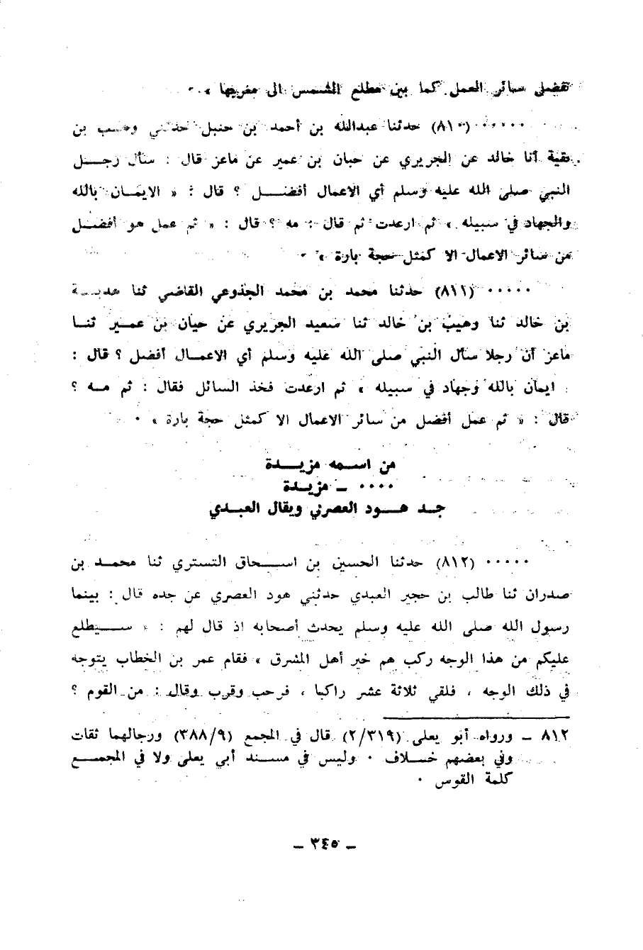 810 - حَدَّثَنَا عَبْدُ اللهِ بْنُ أَحْمَدَ بْنِ حَنْبَلٍ، حَدَّثَنِي وَهْبُ بْنُ بَقِيَّةَ، أَنَا خَالِدٌ، عَنِ الْجُرَيْرِيِّ، عَنْ حَيَّانَ بْنِ عُمَيْرٍ، عَنْ مَاعِزٍ، قَالَ: سَأَلَ رَجُلٌ النَّبِيَّ صَلَّى اللهُ عَلَيْهِ وَسَلَّمَ: §أَيُّ الْأَعْمَالِ أَفْضَلُ؟ قَالَ: «الْإِيمَانُ بِاللهِ، وَالْجِهَادُ فِي سَبِيلِهِ» ، ثُمَّ أَرْعَدَتْ ثُمَّ قَالَ: مَهْ؟ قَالَ: «ثُمَّ عَمَلٌ هُوَ أَفْضَلُ مِنْ سَائِرِ الْأَعْمَالِ إِلَّا كَمَثَلِ حَجَّةٍ بَارَّةٍ»