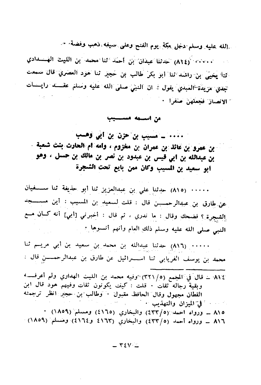 816 - حَدَّثَنَا عَبْدُ اللهِ بْنُ مُحَمَّدِ بْنِ سَعِيدِ بْنِ أَبِي مَرْيَمَ، ثنا مُحَمَّدُ بْنُ يُوسُفَ الْفِرْيَابِيُّ، ثنا إِسْرَائِيلُ، عَنْ طَارِقِ بْنِ عَبْدِ الرَّحْمَنِ، قَالَ: خَرَجْتُ حَاجًّا فَمَرَرْتُ بِقَوْمٍ يُصَلُّونَ عِنْدَ مَسْجِدٍ يَقُولُونَ: هَذِهِ شَجَرَةُ بَيْعَةِ الرِّضْوَانِ حِينَ بَايَعَ رَسُولُ اللهِ صَلَّى اللهُ عَلَيْهِ وَسَلَّمَ، فَأَتَيْتُ سَعِيدَ بْنَ الْمُسَيِّبِ فَأَخْبَرْتُهُ فَقَالَ: حَدَّثَنِي أَبِي أَنَّهُ «كَانَ فِيمَنْ §بَايَعَ رَسُولَ اللهِ صَلَّى اللهُ عَلَيْهِ وَسَلَّمَ تَحْتَ الشَّجَرَةِ» قَالَ: فَلَمَّا خَرَجْنَا مِنَ الْعَامِ الْمُقْبِلِ نَسِينَاهَا، فَلَمْ نَقْدِرْ عَلَيْهَا، قَالَ سَعِيدٌ: «فَإِنْ كَانَ أَصْحَابُ رَسُولِ اللهِ صَلَّى اللهُ عَلَيْهِ وَسَلَّمَ لَمْ يَعْلَمُوهَا وَعَلِمْتُمُوهَا فَأَنْتُمْ أَعْلَمُ»