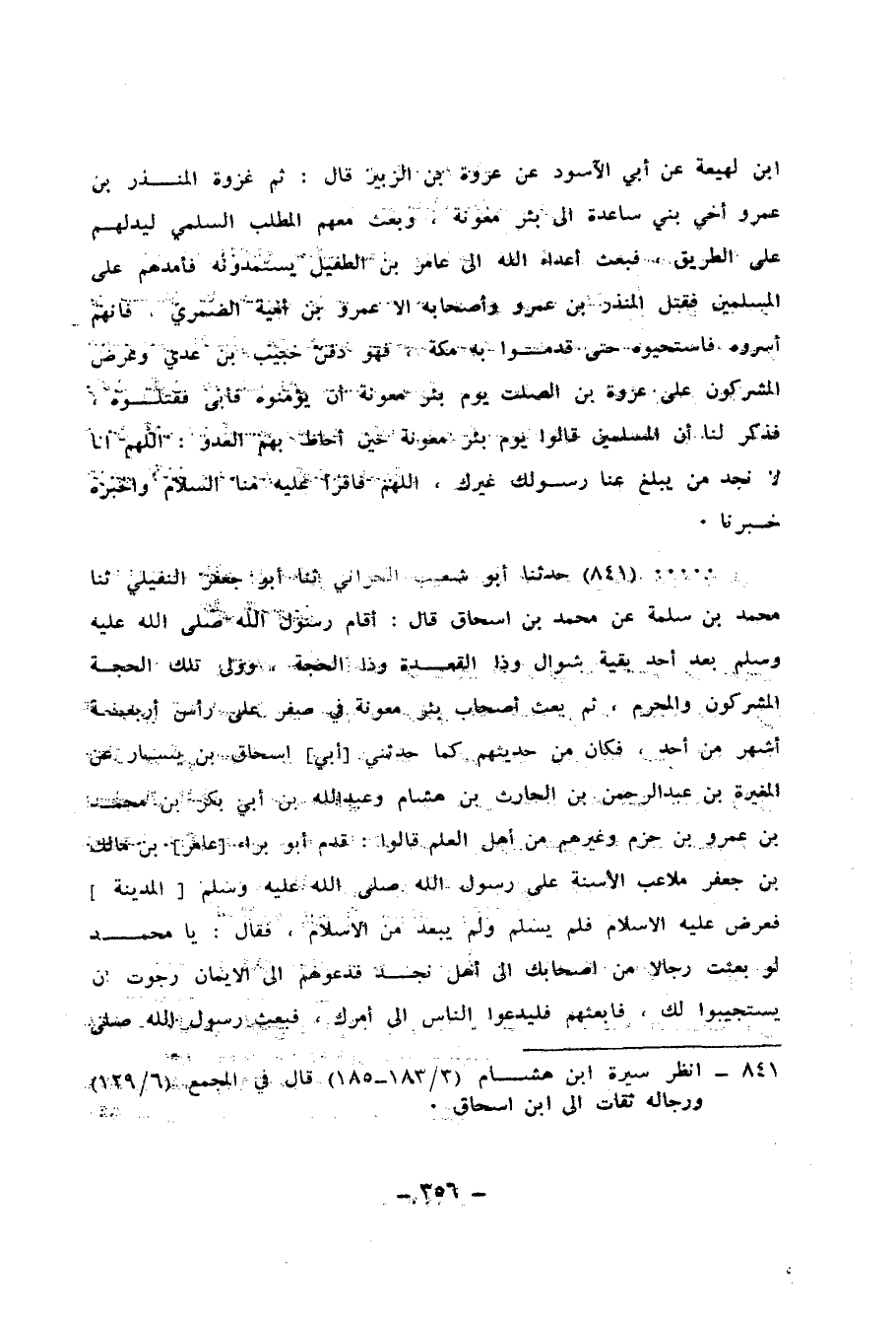841 - حَدَّثَنَا أَبُو شُعَيْبٍ الْحَرَّانِيُّ، ثنا أَبُو جَعْفَرٍ النُّفَيْلِيُّ، ثنا مُحَمَّدُ بْنُ سَلَمَةَ، عَنْ مُحَمَّدِ بْنِ إِسْحَاقَ قَالَ: «§أَقَامَ رَسُولُ اللهِ صَلَّى اللهُ عَلَيْهِ وَسَلَّمَ بَعْدَ أُحُدٍ بَقِيَّةَ شَوَّالٍ، وَذَا الْقَعْدَةِ، وَذَا الْحِجَّةِ وَوَلِيَ تِلْكَ الْحَجَّةَ الْمُشْرِكُونَ، وَالْمُحَرَّمَ، ثُمَّ بَعَثَ أَصْحَابَ بِئْرِ مَعُونَةَ فِي سَفَرٍ عَلَى رَأْسِ أَرْبَعَةِ أَشْهُرٍ مِنْ أُحُدٍ»