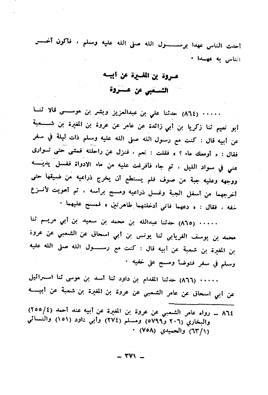 864 - حَدَّثَنَا عَلِيُّ بْنُ عَبْدِ الْعَزِيزِ، وَبِشْرُ بْنُ مُوسَى، قَالَا: ثنا أَبُو نُعَيْمٍ، ثنا زَكَرِيَّا بْنُ أَبِي زَائِدَةَ، عَنْ عَامِرٍ، عَنْ عُرْوَةَ بْنِ الْمُغِيرَةِ بْنِ شُعْبَةَ، عَنْ أَبِيهِ، قَالَ: كُنْتُ مَعَ رَسُولِ اللهِ صَلَّى اللهُ عَلَيْهِ وَسَلَّمَ ذَاتَ لَيْلَةٍ فِي سَفَرٍ فَقَالَ: «أَوَ مَعَكَ مَاءٌ؟» فَقُلْتُ: نَعَمْ، فَنَزَلَ عَنْ رَاحِلَتِهِ فَمَشَى حَتَّى تَوَارَى عَنِّي فِي سَوَّادِ اللَّيْلِ، ثُمَّ جَاءَ فَأَفْرَغْتُ عَلَيْهِ مِنْ مَاءِ الْإِدَوَاةِ، فَغَسَلَ يَدَيْهِ وَوَجْهَهُ وَعَلَيْهِ جُبَّةٌ مِنْ صُوفٍ، فَلَمْ يَسْتَطِعْ أَنْ يُخْرِجَ ذِرَاعَيْهِ مِنْ ضِيقِهَا حَتَّى أَخْرَجَهُمَا مِنْ أَسْفَلِ الْجُبَّةِ، وَغَسَلَ ذِرَاعَيْهِ وَمَسَحَ بِرَأْسِهِ، ثُمَّ أَهْوَيْتُ لِأَنْزِعَ خُفَّهُ، فَقَالَ: «§دَعْهُمَا فَإِنِّي أَدْخَلْتُهُمَا طَاهِرَتَيْنِ» فَمَسَحَ عَلَيْهِمَا