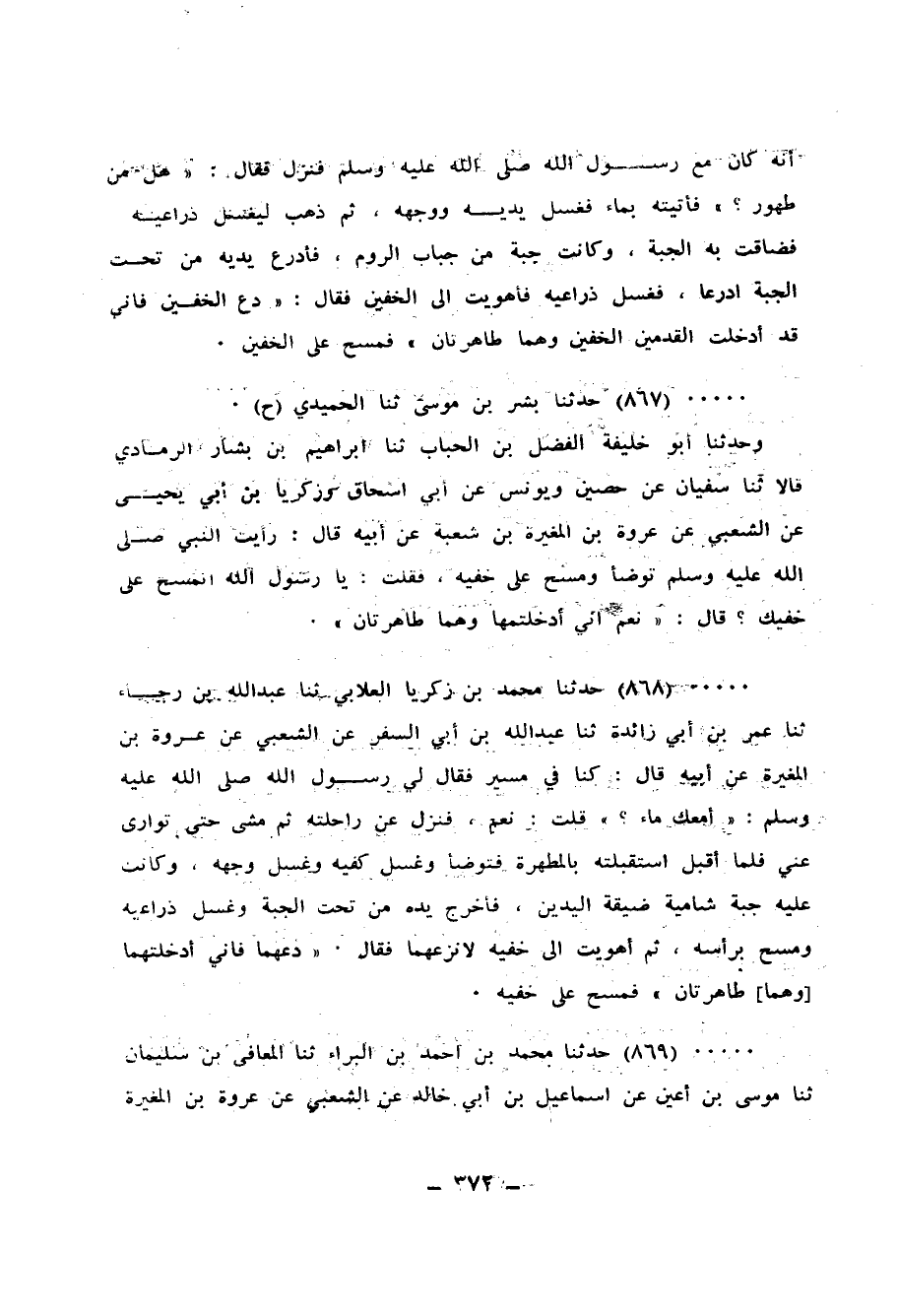 867 - حَدَّثَنَا بِشْرُ بْنُ مُوسَى، ثنا الْحُمَيْدِيُّ، ح وَحَدَّثَنَا أَبُو خَلِيفَةَ الْفَضْلُ بْنُ الْحُبَابِ، ثنا إِبْرَاهِيمُ بْنُ بَشَّارٍ الرَّمَادِيُّ، قَالَا: ثنا سُفْيَانُ، عَنْ حُصَيْنٍ، وَيُونُسَ، عَنْ أَبِي إِسْحَاقَ، وَزَكَرِيَّا بْنِ أَبِي يَحْيَى، عَنِ الشَّعْبِيِّ، عَنْ عُرْوَةَ بْنِ الْمُغِيرَةِ بْنِ شُعْبَةَ، عَنْ أَبِيهِ، قَالَ: رَأَيْتُ النَّبِيَّ صَلَّى اللهُ عَلَيْهِ وَسَلَّمَ " §تَوَضَّأَ وَمَسَحَ عَلَى خُفَّيْهِ، فَقُلْتُ: يَا رَسُولَ اللهِ، أَتَمْسَحُ عَلَى خُفَّيْكَ؟ قَالَ: «نَعَمْ، إِنِّي أَدْخَلْتُهُمَا وَهُمَا طَاهِرَتَانِ»