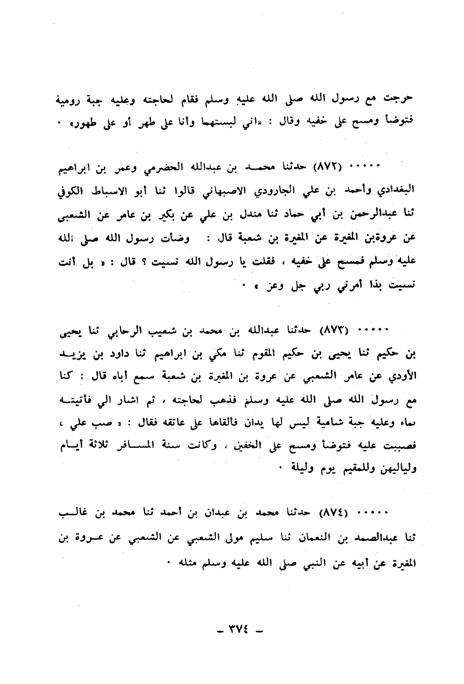 872 - حَدَّثَنَا مُحَمَّدُ بْنُ عَبْدِ اللهِ الْحَضْرَمِيُّ، وَعُمَرُ بْنُ إِبْرَاهِيمَ الْبَغْدَادِيُّ، وَأَحْمَدُ بْنُ عَلِيٍّ الْجَارُودِيُّ الْأَصْبَهَانِيُّ قَالُوا: ثنا أَبُو الْأَسْبَاطِ الْكُوفِيُّ، ثنا عَبْدُ الرَّحْمَنِ بْنُ أَبِي حَمَّادٍ، ثنا مِنْدَلُ بْنُ عَلِيٍّ، عَنْ بُكَيْرِ بْنِ عَامِرٍ، عَنِ الشَّعْبِيِّ، عَنْ عُرْوَةَ بْنِ الْمُغِيرَةِ، عَنِ الْمُغِيرَةِ بْنِ شُعْبَةَ قَالَ: وَضَّأْتُ رَسُولَ اللهِ صَلَّى اللهُ عَلَيْهِ وَسَلَّمَ §فَمَسَحَ عَلَى خُفَّيْهِ، فَقُلْتُ: يَا رَسُولَ اللهِ نَسِيتَ؟ قَالَ: «بَلْ أَنْتَ نَسِيتَ، بِذَا أَمَرَنِي رَبِّي جَلَّ وَعَزَّ»