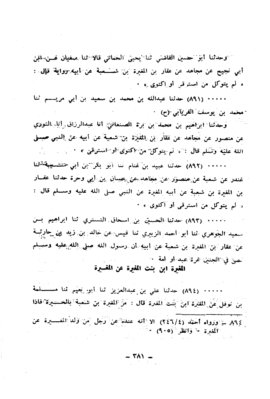 891 - حَدَّثَنَا عَبْدُ اللهِ بْنُ مُحَمَّدِ بْنِ سَعِيدِ بْنِ أَبِي مَرْيَمَ، ثنا مُحَمَّدُ بْنُ يُوسُفَ الْفِرْيَابِيُّ، ح وَحَدَّثَنَا إِبْرَاهِيمُ بْنُ مُحَمَّدِ بْنِ بَرَّةَ الصَّنْعَانِيُّ، أَنَا عَبْدُ الرَّزَّاقِ، أَنَا الثَّوْرِيُّ، عَنْ مَنْصُورٍ، عَنْ مُجَاهِدٍ، عَنْ عَقَّارِ بْنِ الْمُغِيرَةِ بْنِ شُعْبَةَ، عَنْ أَبِيهِ، عَنِ النَّبِيِّ صَلَّى اللهُ عَلَيْهِ وَسَلَّمَ قَالَ: «§لَمْ يَتَوَكَّلْ مَنِ اكْتَوَى أَوِ اسْتَرْقَى»