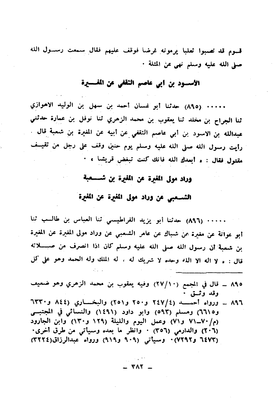895 - حَدَّثَنَا أَبُو غَسَّانَ أَحْمَدُ بْنُ سَهْلِ بْنِ الْوَلِيدِ الْأَهْوَازِيُّ، ثنا الْجَرَّاحُ بْنُ مَخْلَدٍ، ثنا يَعْقُوبُ بْنُ مُحَمَّدٍ الزُّهْرِيُّ، ثنا نَوْفَلُ بْنُ عُمَارَةَ، حَدَّثَنِي عَبْدُ اللهِ بْنُ الْأَسْوَدِ بْنِ أَبِي عَاصِمٍ الثَّقَفِيُّ، عَنْ أَبِيهِ، عَنِ الْمُغِيرَةِ بْنِ شُعْبَةَ قَالَ: رَأَيْتُ رَسُولَ اللهِ صَلَّى اللهُ عَلَيْهِ وَسَلَّمَ يَوْمَ حُنَيْنٍ وَقَفَ عَلَى رَجُلٍ مِنْ ثَقِيفٍ مَقْتُولٍ فَقَالَ: «§أَبْعَدَكَ اللهُ، فَإِنَّكَ كُنْتَ تَبْغَضُ قُرَيْشًا»