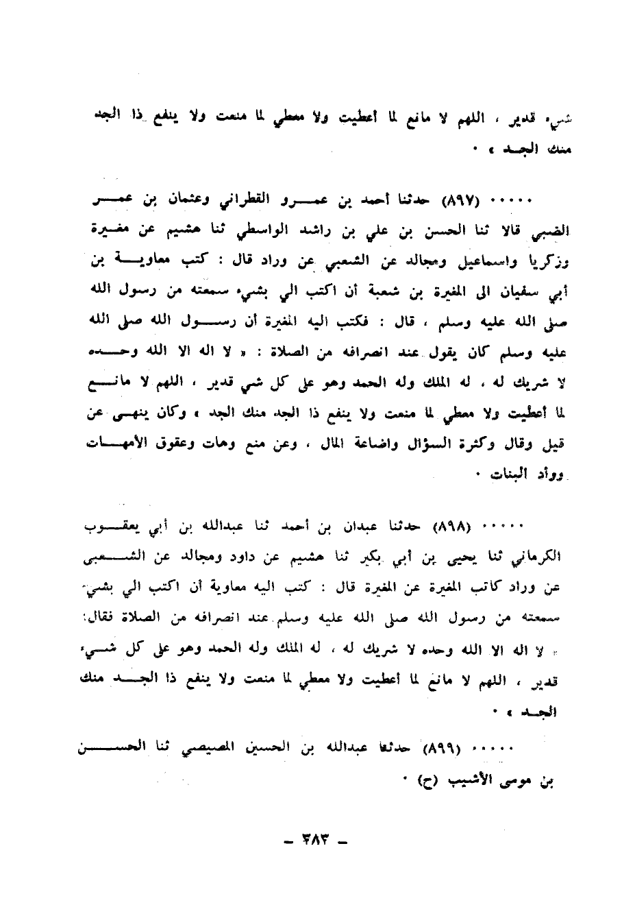 899 - حَدَّثَنَا عَبْدُ اللهِ بْنُ الْحُسَيْنِ الْمِصِّيصِيُّ، ثنا الْحَسَنُ بْنُ مُوسَى الْأَشْيَبُ، ح وَحَدَّثَنَا مُحَمَّدُ بْنُ عَبْدِ اللهِ الْحَضْرَمِيُّ، ثنا مُحَمَّدُ بْنُ مَنْصُورٍ الطُّوسِيُّ، ثنا الْحَسَنُ بْنُ مُوسَى الْأَشْيَبُ، ثنا شَيْبَانُ، عَنْ عَاصِمِ بْنِ أَبِي النَّجُودِ، عَنِ الشَّعْبِيِّ، عَنْ وَرَّادٍ، عَنِ الْمُغِيرَةِ بْنِ شُعْبَةَ، قَالَ: كَانَ رَسُولُ اللهِ صَلَّى اللهُ عَلَيْهِ وَسَلَّمَ إِذَا انْصَرَفَ مِنَ الصَّلَاةِ قَالَ: «§لَا إِلَهَ إِلَّا اللهُ وَحْدَهُ لَا شَرِيكَ لَهُ، لَهُ الْمُلْكُ، وَلَهُ الْحَمْدُ، وَهُوَ عَلَى كُلِّ شَيْءٍ قَدِيرٌ، اللهُمَّ لَا مَانِعَ لِمَا أَعْطَيْتَ، وَلَا مُعْطِيَ لِمَا مَنَعْتَ، وَلَا يَنْفَعُ ذَا الْجَدِّ مِنْكَ الْجَدُّ»
