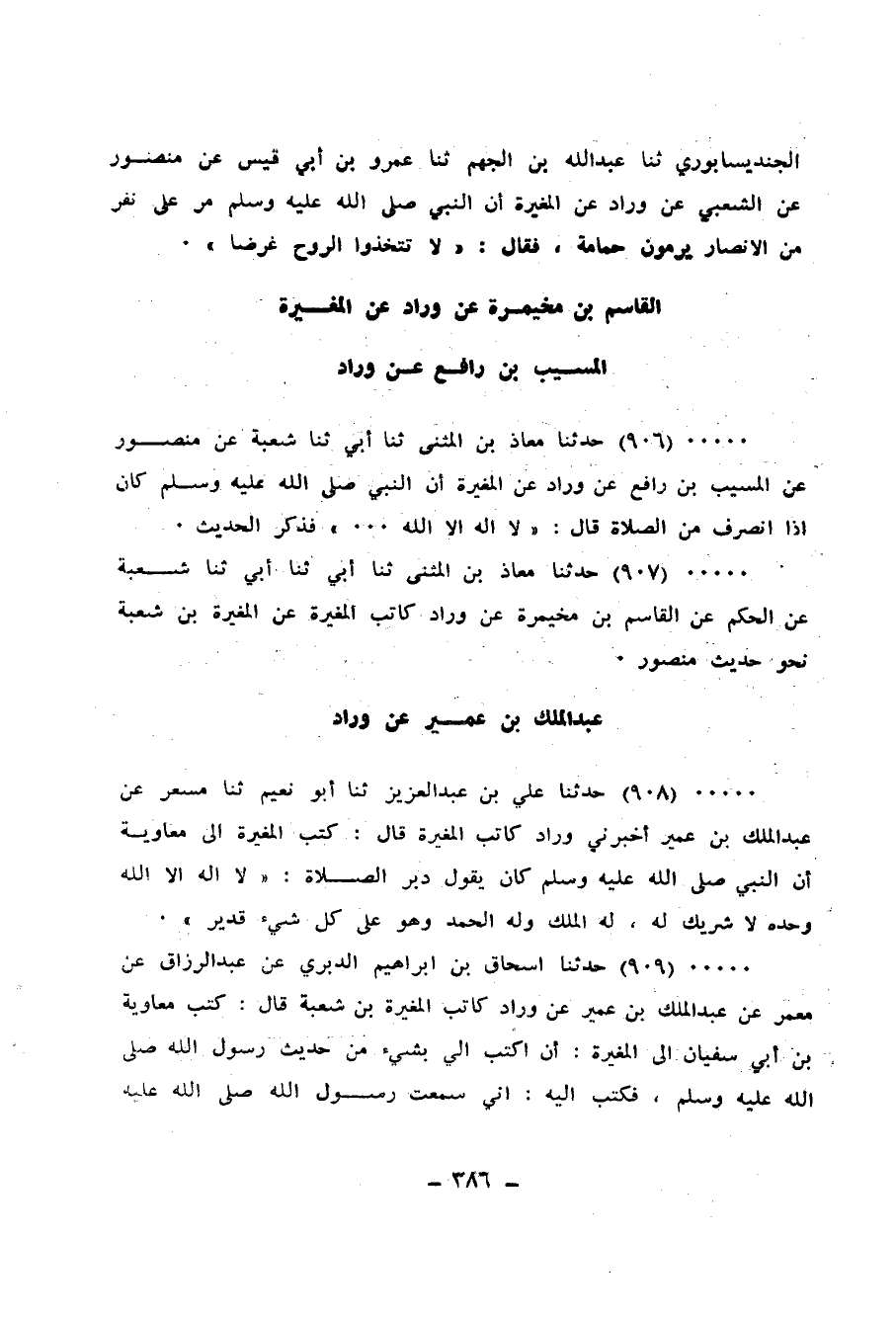 906 - حَدَّثَنَا مُعَاذُ بْنُ الْمُثَنَّى، ثنا أَبِي، ثنا شُعْبَةُ، عَنْ مَنْصُورٍ، عَنِ الْمُسَيَّبِ بْنِ رَافِعٍ، عَنْ وَرَّادٍ، عَنِ الْمُغِيرَةِ، أَنَّ النَّبِيَّ صَلَّى اللهُ عَلَيْهِ وَسَلَّمَ كَانَ إِذَا انْصَرَفَ مِنْ صَلَاةٍ قَالَ: «§لَا إِلَهَ إِلَّا اللهُ» . . . . فَذَكَرَ الْحَدِيثَ