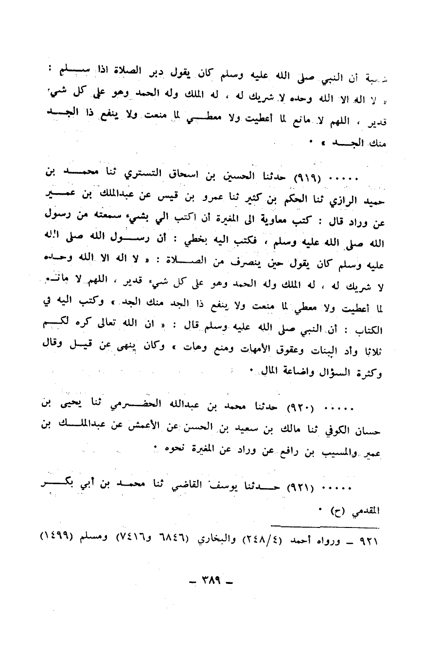 919 - حَدَّثَنَا الْحُسَيْنُ بْنُ إِسْحَاقَ التُّسْتَرِيُّ، ثنا مُحَمَّدُ بْنُ حُمَيْدٍ الرَّازِيُّ، ثنا الْحَكَمُ بْنُ بَشِيرٍ، ثنا عَمْرُو بْنُ قَيْسٍ، عَنْ عَبْدِ الْمَلِكِ بْنِ عُمَيْرٍ، عَنْ وَرَّادٍ قَالَ: كَتَبَ مُعَاوِيَةُ إِلَى الْمُغِيرَةِ: أَنِ أَكْتُبْ إِلَيَّ بِشَيْءٍ سَمِعْتَهُ مِنْ رَسُولِ اللهِ صَلَّى اللهُ عَلَيْهِ وَسَلَّمَ، فَكَتَبَ إِلَيْهِ بِخَطِّي: إِنَّ رَسُولَ اللهِ صَلَّى اللهُ عَلَيْهِ وَسَلَّمَ كَانَ يَقُولُ حِينَ يَنْصَرِفُ مِنَ الصَّلَاةِ: «§لَا إِلَهَ إِلَّا اللهُ وَحْدَهُ لَا شَرِيكَ لَهُ، لَهُ الْمُلْكُ، وَلَهُ الْحَمْدُ، وَهُوَ عَلَى كُلِّ شَيْءٍ قَدِيرٌ، اللهُمَّ لَا مَانِعَ لِمَا أَعْطَيْتَ، وَلَا مُعْطِيَ لِمَا مَنَعْتَ، وَلَا يَنْفَعُ ذَا الْجَدِّ مِنْكَ الْجَدُّ»