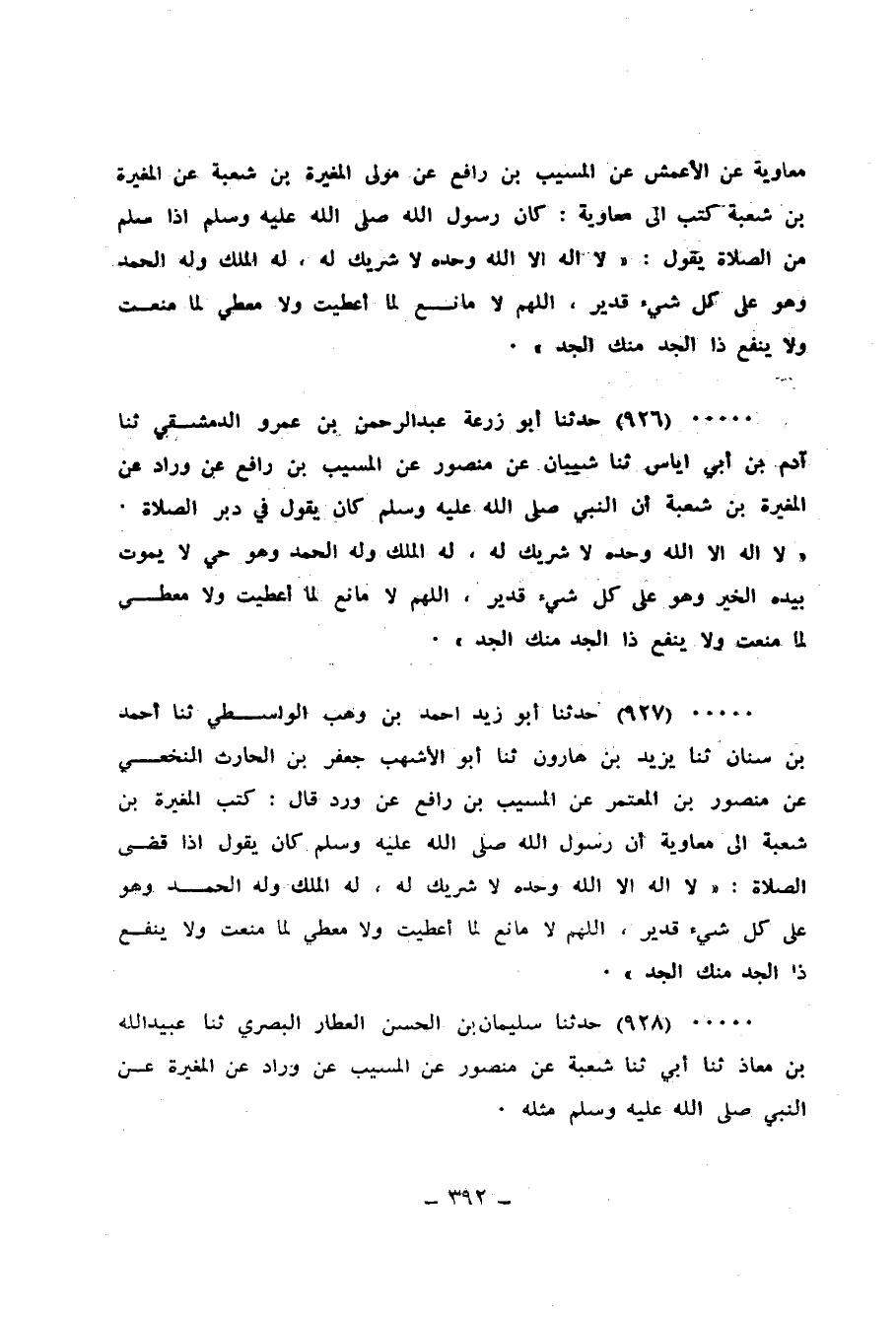 927 - حَدَّثَنَا أَبُو زَيْدٍ أَحْمَدُ بْنُ وَهْبٍ الْوَاسِطِيُّ، ثنا أَحْمَدُ بْنُ سِنَانٍ، ثنا يَزِيدُ بْنُ هَارُونَ، ثنا أَبُو الْأَشْهَبِ جَعْفَرُ بْنُ الْحَارِثِ النَّخَعِيُّ، عَنْ مَنْصُورِ بْنِ الْمُعْتَمِرِ، عَنِ الْمُسَيَّبِ بْنِ رَافِعٍ، عَنْ وَرَّادٍ قَالَ: كَتَبَ الْمُغِيرَةُ بْنُ شُعْبَةَ إِلَى مُعَاوِيَةَ: أَنَّ رَسُولَ اللهِ صَلَّى اللهُ عَلَيْهِ وَسَلَّمَ كَانَ يَقُولُ إِذَا قَضَى الصَّلَاةَ: «§لَا إِلَهَ إِلَّا اللهُ وَحْدَهُ لَا شَرِيكَ لَهُ، لَهُ الْمُلْكُ وَلَهُ الْحَمْدُ، وَهُوَ عَلَى كُلِّ شَيْءٍ قَدِيرٌ، اللهُمَّ لَا مَانِعَ لِمَا أَعْطَيْتَ، وَلَا مُعْطِيَ لِمَا مَنَعْتَ، وَلَا يَنْفَعُ ذَا الْجَدِّ مِنْكَ الْجَدُّ»