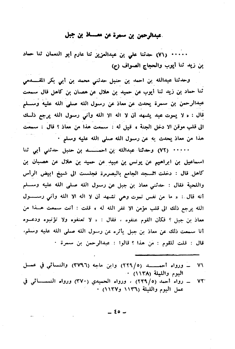 71 - حَدَّثَنَا عَلِيُّ بْنُ عَبْدِ الْعَزِيزِ، ثنا عَارِمٌ أَبُو النُّعْمَانِ، ثنا حَمَّادُ بْنُ زَيْدٍ، ثنا أَيُّوبُ، وَالْحَجَّاجُ الصَّوَّافُ، ح وَحَدَّثَنَا عَبْدُ اللهِ بْنُ أَحْمَدَ بْنِ حَنْبَلٍ، حَدَّثَنِي مُحَمَّدُ بْنُ أَبِي بَكْرٍ الْمُقَدَّمِيُّ، ثنا حَمَّادُ بْنُ زَيْدٍ، ثنا أَيُّوبُ، عَنْ حُمَيْدِ بْنِ هِلَالٍ، عَنْ هِصَّانَ بْنِ كَاهِلٍ، قَالَ: سَمِعْتُ عَبْدَ الرَّحْمَنِ بْنَ سَمُرَةَ يُحَدِّثُ، عَنْ مُعَاذٍ، عَنْ رَسُولِ اللهِ صَلَّى اللهُ عَلَيْهِ وَسَلَّمَ قَالَ: «§لَا يَمُوتُ عَبْدٌ يَشْهَدُ أَنْ لَا إِلَهَ إِلَّا اللهُ وَأَنِّي رَسُولُ اللهِ يُرْجِعُ ذَلِكَ إِلَى قَلْبٍ مُوقِنٍ إِلَّا دَخَلَ الْجَنَّةَ» قِيلَ لَهُ: سَمِعْتَ هَذَا مِنْ مُعَاذٍ؟ قَالَ: سَمِعْتُ هَذَا مِنْ مُعَاذٍ يُحَدِّثُ بِهِ عَنْ رَسُولِ اللهِ صَلَّى اللهُ عَلَيْهِ وَسَلَّمَ