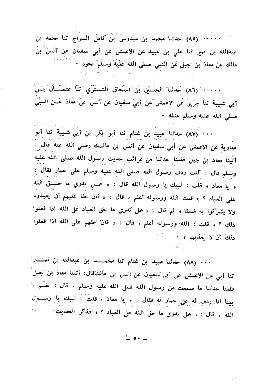 88 - حَدَّثَنَا عُبَيْدُ بْنُ غَنَّامٍ، ثنا مُحَمَّدُ بْنُ عَبْدِ اللهِ بْنِ نُمَيْرٍ، ثنا أَبِي، عَنِ الْأَعْمَشِ، عَنْ أَبِي سُفْيَانَ، عَنْ أَنَسِ بْنِ مَالِكٍ، قَالَ: أَتَيْنَا مُعَاذَ بْنَ جَبَلٍ فَقُلْنَا لَهُ: حَدِّثْنَا مَا سَمِعْتَ مِنْ رَسُولِ اللهِ صَلَّى اللهُ عَلَيْهِ وَسَلَّمَ، قَالَ: نَعَمْ، بَيْنَا أَنَا رِدْفٌ لَهُ عَلَى حِمَارٍ لَهُ فَقَالَ: «يَا مُعَاذُ» قُلْتُ: لَبَّيْكَ يَا رَسُولَ اللهِ، قَالَ: «هَلْ تَدْرِي مَا حَقُّ اللهِ عَلَى الْعِبَادِ؟» فَذَكَرَ الْحَدِيثَ