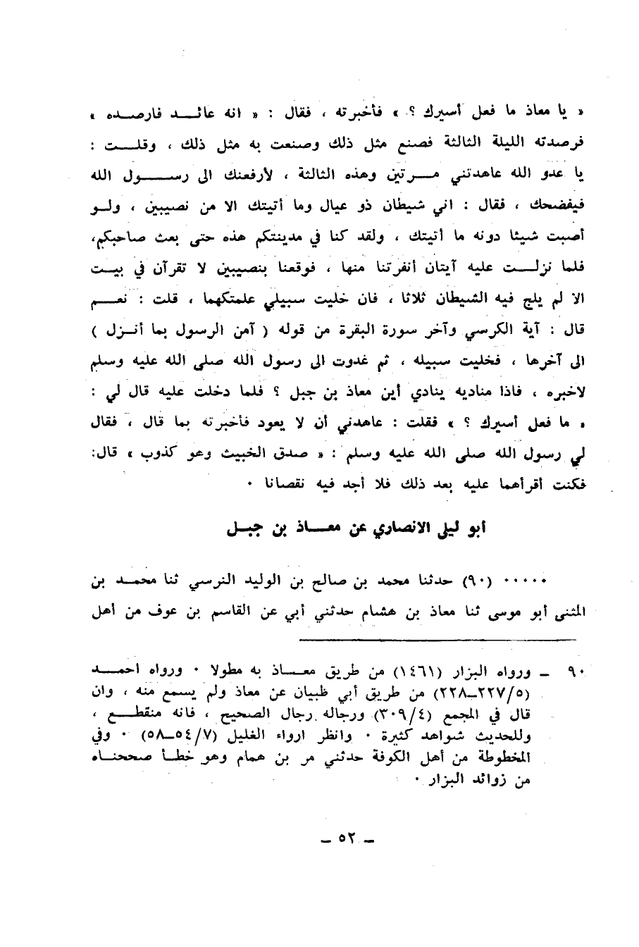 90 - حَدَّثَنَا مُحَمَّدُ بْنُ صَالِحِ بْنِ الْوَلِيدِ النَّرْسِيُّ، ثنا مُحَمَّدُ بْنُ الْمُثَنَّى أَبُو مُوسَى، ثنا مُعَاذُ بْنُ هِشَامٍ، حَدَّثَنِي أَبِي، عَنِ الْقَاسِمِ بْنِ عَوْفٍ، مِنْ أَهْلِ الْكُوفَةِ مِنْ بَنِي مَرَّةَ بْنِ هَمَّامٍ، عَنْ عَبْدِ الرَّحْمَنِ بْنِ أَبِي لَيْلَى، عَنْ أَبِيهِ، عَنْ مُعَاذِ بْنِ جَبَلٍ، قَالَ: قَالَ رَسُولُ اللهِ صَلَّى اللهُ عَلَيْهِ وَسَلَّمَ: «§لَوْ كُنْتُ آمِرًا أَحَدًا أَنْ يَسْجُدَ لِأَحَدٍ لَأَمَرْتُ الْمَرْأَةَ أَنْ تَسْجُدَ لِزَوْجِهَا مِنْ حَقِّهِ عَلَيْهَا، وَلَا تَجِدُ امْرَأَةٌ حَلَاوَةَ الْإِيمَانِ حَتَّى تُؤَدِّيَ حَقَّ زَوْجِهَا، وَلَوْ سَأَلَهَا نَفْسَهَا عَلَى قَتَبٍ»
