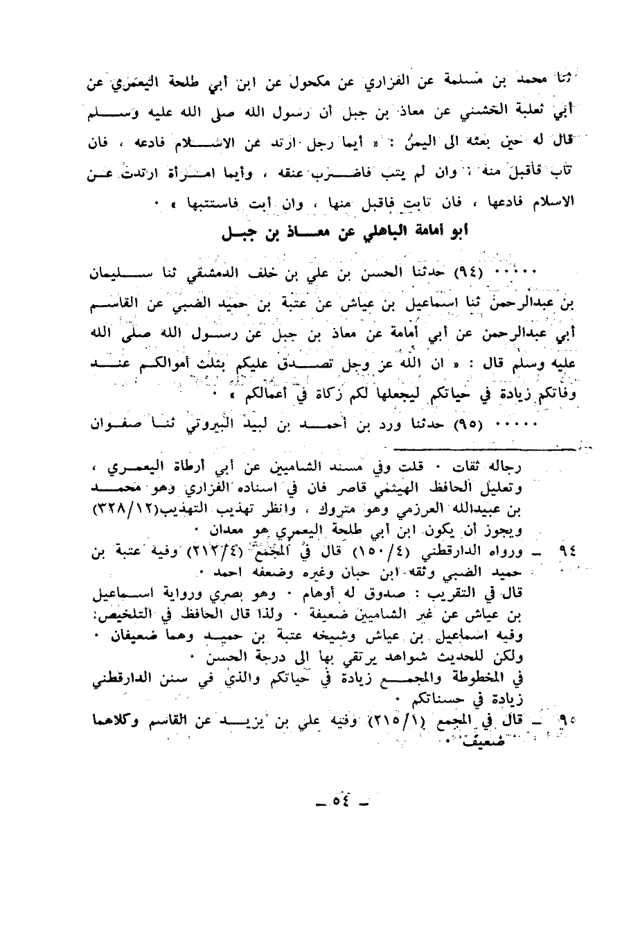 94 - حَدَّثَنَا الْحَسَنُ بْنُ عَلِيِّ بْنِ خَلَفٍ الدِّمَشْقِيُّ، ثنا سُلَيْمَانُ بْنُ عَبْدِ الرَّحْمَنِ، ثنا إِسْمَاعِيلُ بْنُ عَيَّاشٍ، عَنْ عُتْبَةَ بْنِ حُمَيْدٍ الضَّبِّيُّ، عَنِ الْقَاسِمِ أَبِي عَبْدِ الرَّحْمَنِ، عَنْ أَبِي أُمَامَةَ، عَنْ مُعَاذِ بْنِ جَبَلٍ، عَنْ رَسُولِ اللهِ صَلَّى اللهُ عَلَيْهِ وَسَلَّمَ قَالَ: «إِنَّ §اللهَ عَزَّ وَجَلَّ تَصَدَّقَ عَلَيْكُمْ بِثُلُثِ أَمْوَالَكُمْ عِنْدَ وَفَاتِكُمْ زِيَادَةً فِي حَيَاتِكُمْ لِيَجْعَلَهَا لَكُمْ زَكَاةً فِي أَعْمَالِكُمْ»