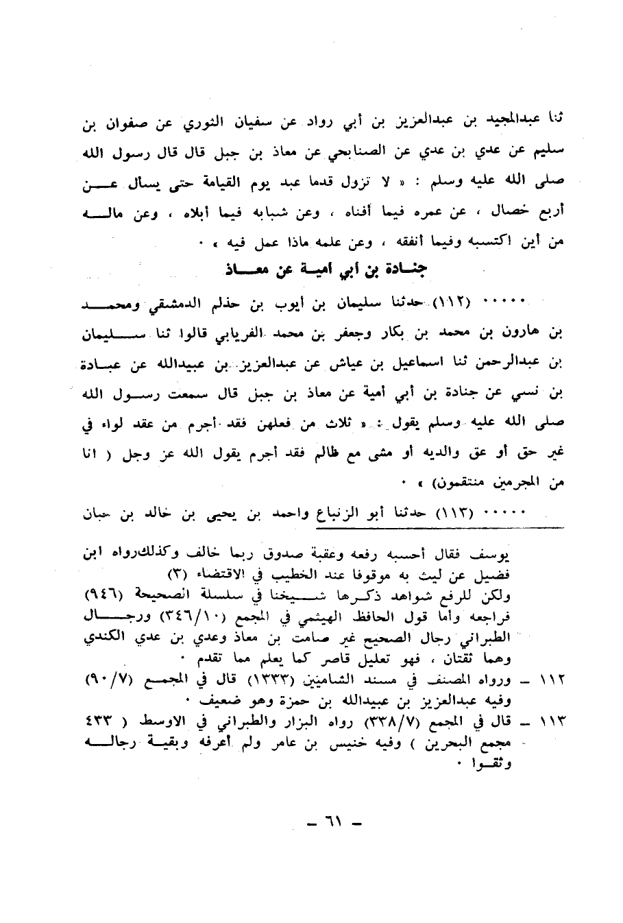 112 - حَدَّثَنَا سُلَيْمَانُ بْنُ أَيُّوبَ بْنِ حَذْلَمٍ الدِّمَشْقِيُّ، وَمُحَمَّدُ بْنُ هَارُونَ بْنِ مُحَمَّدِ بْنِ بَكَّارٍ، وَجَعْفَرُ بْنُ مُحَمَّدٍ الْفِرْيَابِيُّ قَالُوا: ثنا سُلَيْمَانُ بْنُ عَبْدِ الرَّحْمَنِ، ثنا إِسْمَاعِيلُ بْنُ عَيَّاشٍ، عَنْ عَبْدِ الْعَزِيزِ بْنِ عُبَيْدِ اللهِ، عَنْ عُبَادَةَ بْنِ نَسِيٍّ، عَنْ جُنَادَةَ بْنِ أَبِي أُمَيَّةَ، عَنْ مُعَاذِ بْنِ جَبَلٍ، قَالَ: سَمِعْتُ رَسُولَ اللهِ صَلَّى اللهُ عَلَيْهِ وَسَلَّمَ يَقُولُ: " §ثَلَاثٌ مَنْ فَعَلَهُنَّ فَقَدْ أَجْرَمَ: مَنْ عَقَدَ لِوَاءً فِي غَيْرِ حَقٍّ، أَوْ عَقَّ وَالِدَيْهِ، أَوْ مَشَى مَعَ ظَالِمٍ، فَقَدْ أَجْرَمَ، يَقُولُ اللهُ عَزَّ وَجَلَّ: {إِنَّا مِنَ الْمُجْرِمِينَ مُنْتَقِمُونَ} [السجدة: 22] "