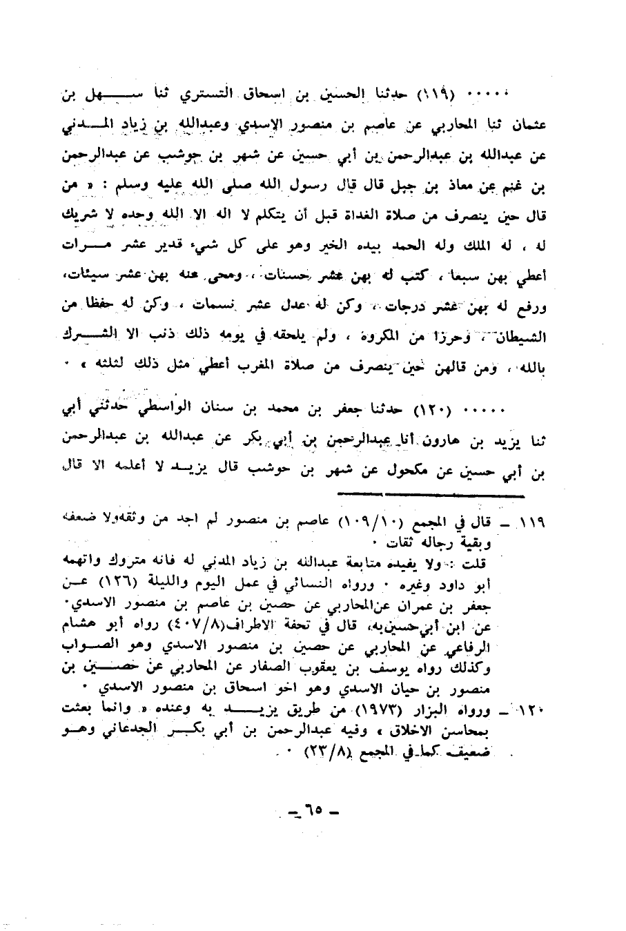 119 - حَدَّثَنَا الْحُسَيْنُ بْنُ إِسْحَاقَ التُّسْتَرِيُّ، ثنا سَهْلُ بْنُ عُثْمَانَ، ثنا الْمُحَارِبِيُّ، عَنْ عَاصِمِ بْنِ مَنْصُورٍ الْأَسَدِيِّ، وَعَبْدِ اللهِ بْنِ زِيَادٍ الْمَدَنِيِّ، عَنْ عَبْدِ اللهِ بْنِ عَبْدِ الرَّحْمَنِ بْنِ أَبِي حُسَيْنٍ، عَنْ شَهْرِ بْنِ حَوْشَبٍ، عَنْ عَبْدِ الرَّحْمَنِ بْنِ غَنْمٍ، عَنْ مُعَاذِ بْنِ جَبَلٍ قَالَ: قَالَ رَسُولُ اللهِ صَلَّى اللهُ عَلَيْهِ وَسَلَّمَ: " §مَنْ قَالَ حِينَ يَنْصَرِفُ مَنْ صَلَاةِ الْغَدَاةِ قَبْلَ أَنْ يَتَكَلَّمَ: لَا إِلَهَ إِلَّا اللهُ وَحْدَهُ لَا شَرِيكَ لَهُ، لَهُ الْمُلْكُ وَلَهُ الْحَمْدُ بِيَدِهِ الْخَيْرُ وَهُوَ عَلَى كُلِّ شَيْءٍ قَدِيرٌ عَشَرَ مَرَّاتٍ، أُعْطِيَ بِهِنَّ سَبْعًا كُتِبَ لَهُ بِهِنَّ عَشَرُ حَسَنَاتٍ، وَمُحِيَ عَنْهُ بِهِنَّ عَشَرُ سَيِّئَاتٍ، وَرُفِعَ لَهُ بِهِنَّ عَشَرُ دَرَجَاتٍ، وَكُنَّ لَهُ عَدْلَ عَشْرِ نَسَمَاتٍ، وَكُنَّ لَهُ حِفْظًا مِنَ الشَّيْطَانِ، وَحِرْزًا مِنَ الْمَكْرُوهِ، وَلَمْ يَلْحَقْهُ فِي يَوْمِهِ ذَلِكَ ذَنْبٌ إِلَّا الشِّرْكَ بِاللهِ، وَمَنْ قَالَهُنَّ حِينَ يَنْصَرِفُ مِنْ صَلَاةِ الْمَغْرِبِ أُعْطِيَ مِثْلَ ذَلِكَ لِثُلُثِهِ "