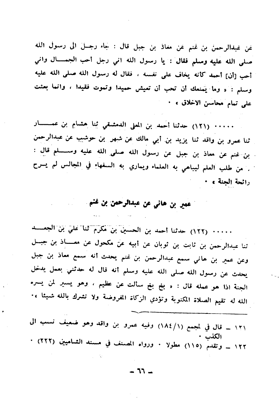 121 - حَدَّثَنَا أَحْمَدُ بْنُ الْمُعَلَّى الدِّمَشْقِيُّ، ثنا هِشَامُ بْنُ عَمَّارٍ، ثنا عَمْرُو بْنُ وَاقِدٍ، ثنا يَزِيدُ بْنُ أَبِي مَالِكٍ، عَنْ شَهْرِ بْنِ حَوْشَبٍ، عَنْ عَبْدِ الرَّحْمَنِ بْنِ غَنْمٍ، عَنْ مُعَاذِ بْنِ جَبَلٍ، عَنْ رَسُولِ اللهِ صَلَّى اللهُ عَلَيْهِ وَسَلَّمَ قَالَ: «§مَنْ طَلَبَ الْعِلْمَ لِيُبَاهِيَ بِهِ الْعُلَمَاءَ، وَيُمَارِيَ بِهِ السُّفَهَاءَ فِي الْمَجَالِسِ، لَمْ يَرَحْ رَائِحَةَ الْجَنَّةِ»