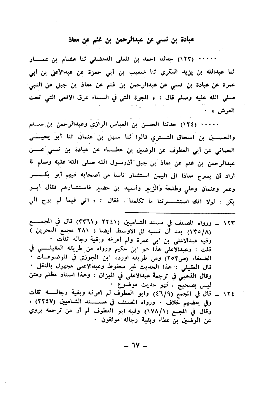 123 - حَدَّثَنَا أَحْمَدُ بْنُ الْمُعَلَّى الدِّمَشْقِيُّ، ثنا هِشَامُ بْنُ عَمَّارٍ، ثنا عَبْدُ اللهِ بْنُ يَزِيدَ الْبَكْرِيُّ، ثنا شُعَيْبُ بْنُ أَبِي حَمْزَةَ، عَنْ عَبْدِ الْأَعْلَى بْنِ أَبِي عَمْرَةَ، عَنْ عُبَادَةَ بْنِ نَسِيٍّ، عَنْ عَبْدِ الرَّحْمَنِ بْنِ غَنْمٍ، عَنْ مُعَاذِ بْنِ جَبَلٍ، عَنِ النَّبِيِّ صَلَّى اللهُ عَلَيْهِ وَسَلَّمَ قَالَ: «§الْمَجَرَّةُ الَّتِي فِي السَّمَاءِ عَرَقُ الْأَفْعَى الَّتِي تَحْتَ الْعَرْشِ»