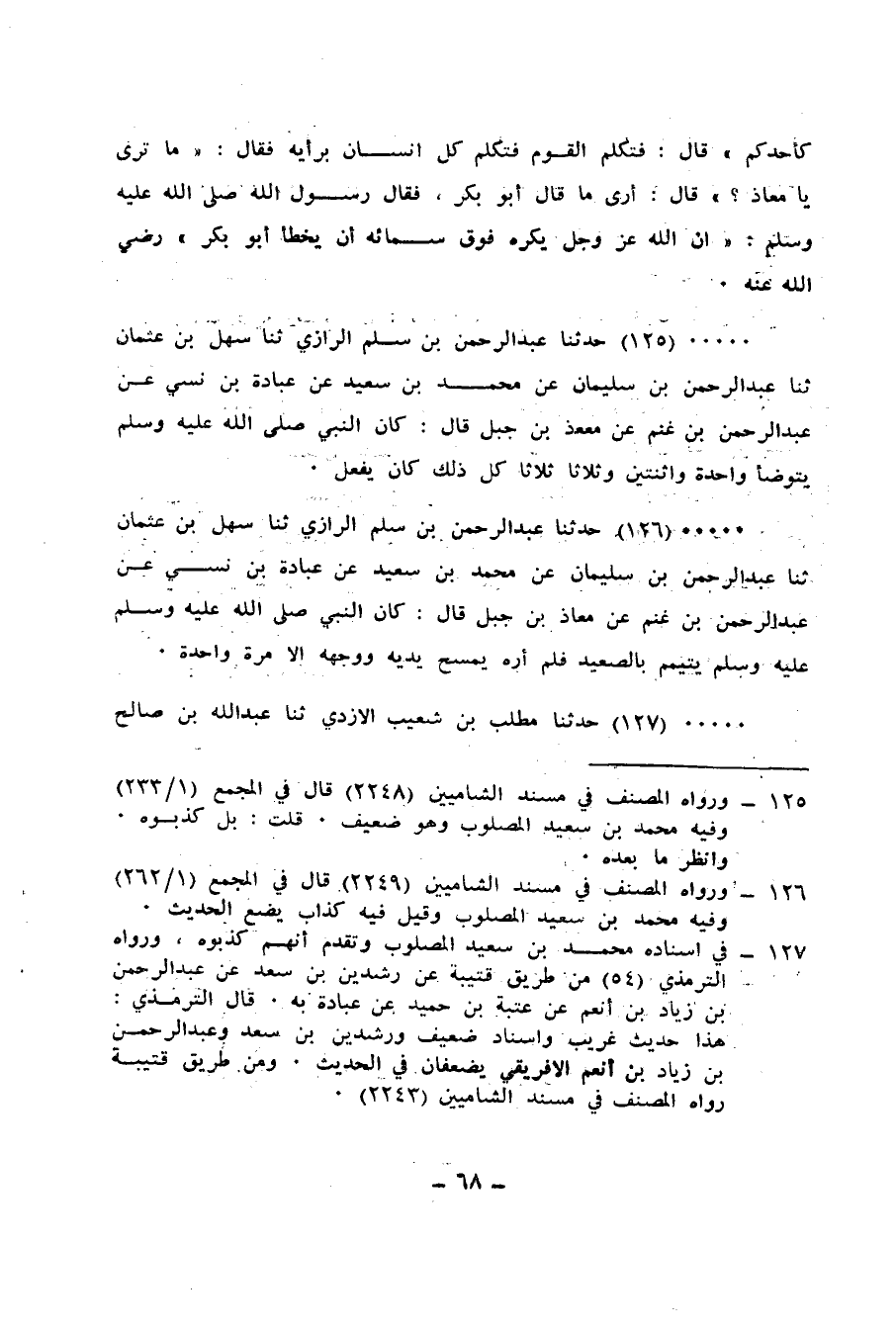 126 - حَدَّثَنَا عَبْدُ الرَّحْمَنِ بْنُ سَلْمٍ الرَّازِيُّ، ثنا سَهْلُ بْنُ عُثْمَانَ، ثنا عَبْدُ الرَّحِيمِ بْنُ سُلَيْمَانَ، عَنْ مُحَمَّدِ بْنِ سَعِيدٍ، عَنْ عُبَادَةَ بْنِ نَسِيٍّ، عَنْ عَبْدِ الرَّحْمَنِ بْنِ غَنْمٍ، عَنْ مُعَاذِ بْنِ جَبَلٍ، قَالَ: «كَانَ النَّبِيُّ صَلَّى اللهُ عَلَيْهِ وَسَلَّمَ §يَتَيَمَّمُ بِالصَّعِيدِ، فَلَمْ أَرَهُ يَمْسَحُ يَدَيْهِ وَوَجْهَهُ إِلَّا مَرَّةً وَاحِدَةً»