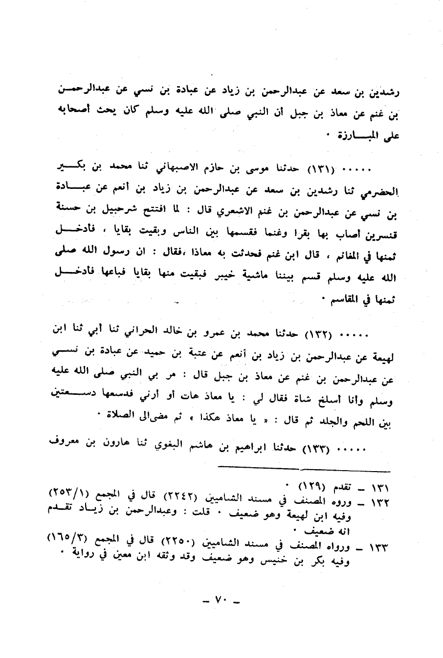 131 - حَدَّثَنَا مُوسَى بْنُ حَازِمٍ الْأَصْبَهَانِيُّ، ثنا مُحَمَّدُ بْنُ بُكَيْرٍ الْحَضْرَمِيُّ، ثنا رِشْدِينَ بْنُ سَعْدٍ، عَنْ عَبْدِ الرَّحْمَنِ بْنِ زِيَادِ بْنِ أَنْعُمٍ، عَنْ عُبَادَةَ بْنِ نَسِيٍّ، عَنْ عَبْدِ الرَّحْمَنِ بْنِ غَنْمٍ الْأَشْعَرِيِّ قَالَ: لَمَّا افْتَتَحَ شُرَحْبِيلُ بْنُ حَسَنَةَ قِنَّسْرِينَ أَصَابَ بِهَا بَقَرًا وَغَنَمًا فَقَسَمَهَا بَيْنَ النَّاسِ، وَبَقِيَتْ بَقَايَا، فَأَدْخَلَ ثَمَنَهَا فِي الْمَغَانِمِ. قَالَ ابْنُ غَنْمٍ: فَحَدَّثْتُ بِهِ مُعَاذًا فَقَالَ: «إِنَّ رَسُولَ اللهِ صَلَّى اللهُ عَلَيْهِ وَسَلَّمَ §قَسَمَ بَيْنَنَا مَاشِيَةَ خَيْبَرَ، فَبَقِيَتْ مِنْهَا بَقَايَا فَبَاعَهَا فَأَدْخَلَ ثَمَنَهَا فِي الْمَقَاسِمِ»