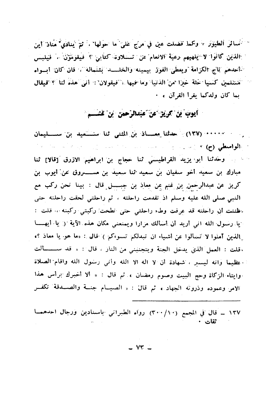 137 - حَدَّثَنَا مُعَاذُ بْنُ الْمُثَنَّى، ثنا سَعِيدُ بْنُ سُلَيْمَانَ الْوَاسِطِيُّ، ح وَحَدَّثَنَا أَبُو يَزِيدَ الْقَرَاطِيسِيُّ، ثنا حَجَّاجُ بْنُ إِبْرَاهِيمَ الْأَزْرَقُ، قَالَا: ثنا مُبَارَكُ بْنُ سَعِيدٍ، أَخُو سُفْيَانَ بْنِ سَعِيدٍ، ثنا سَعِيدُ بْنُ مَسْرُوقٍ، عَنْ أَيُّوبَ بْنِ كَرِيزٍ، عَنْ عَبْدِ الرَّحْمَنِ بْنِ غَنْمٍ، عَنْ مُعَاذِ بْنِ جَبَلٍ قَالَ: بَيْنَا نَحْنُ رَكْبٌ مَعَ النَّبِيِّ صَلَّى اللهُ عَلَيْهِ وَسَلَّمَ، إِذْ تَقَدَّمَتْ رَاحِلَتُهُ، ثُمَّ رَاحِلَتِي لَحِقَتْ رَاحِلَتَهُ حَتَّى ظَنَنْتُ أَنَّ رَاحِلَتَهُ قَدْ عَرَفَتْ وَطْءَ رَاحِلَتِي، حَتَّى نَطَحَتْ رُكْبَتِي رُكْبَتَهُ، قُلْتُ: يَا رَسُولَ اللهِ، إِنِّي أُرِيدُ أَنْ أَسْأَلَكَ مِرَارًا، وَيَمْنَعُنِي مَكَانُ هَذِهِ الْآيَةِ: {يَا أَيُّهَا الَّذِينَ آمَنُوا لَا تَسْأَلُوا عَنْ أَشْيَاءَ إِنْ تُبْدَ لَكُمْ تَسُؤْكُمْ} [المائدة: 101] قَالَ: «مَا هُوَ يَا مُعَاذُ؟» قُلْتُ: الْعَمَلُ الَّذِي يُدْخِلُ الْجَنَّةَ وَيَتَجَنَّبُنِي مِنَ النَّارِ، قَالَ: " §قَدْ سَأَلْتَ عَظِيمًا، وَإِنَّهُ لَيَسِيرٌ: شَهَادَةُ أَنْ لَا إِلَهَ إِلَّا اللهُ، وَأَنِّي رَسُولُ اللهِ، وَإِقَامُ الصَّلَاةِ، وَإِيتَاءُ الزَّكَاةِ، وَحَجُّ الْبَيْتِ، وَصَوْمُ رَمَضَانَ "، ثُمَّ قَالَ: أَلَا أُخْبِرُكَ بِرَأْسِ هَذَا الْأَمْرِ وَعَمُودِهِ وَذِرْوَتِهِ: الْجِهَادِ " ثُمَّ قَالَ: الصِّيَامُ جُنَّةٌ، وَالصَّدَقَةُ تُكَفِّرُ الْخَطَايَا ثُمَّ قَالَ: «أَلَا أُنَبِّئُكَ بِمَا هُوَ أَمْلَكُ بِالنَّاسِ عَنْ ذَلِكَ؟» فَأَخَذَ لِسَانَهُ فَوَضَعَهُ بَيْنَ إِصْبَعَيْنِ مِنْ أَصَابِعِهِ، فَقُلْتُ: يَا رَسُولَ اللهِ، أَكُلُّ مَا نَتَكَلَّمُ بِهِ يُكْتَبُ عَلَيْنَا؟ قَالَ: «ثَكِلَتْكَ أُمُّكَ، وَهَلْ يَكُبُّ النَّاسَ عَلَى مَنَاخِرِهِمْ فِي النَّارِ إِلَّا حَصَائِدُ أَلْسِنَتِهِمْ؟ إِنَّكَ لَمْ تَزَلْ سَالِمًا مَا سَكَتَّ، فَإِذَا تَكَلَّمَتَ كُتِبَ لَكَ أَوْ عَلَيْكَ»