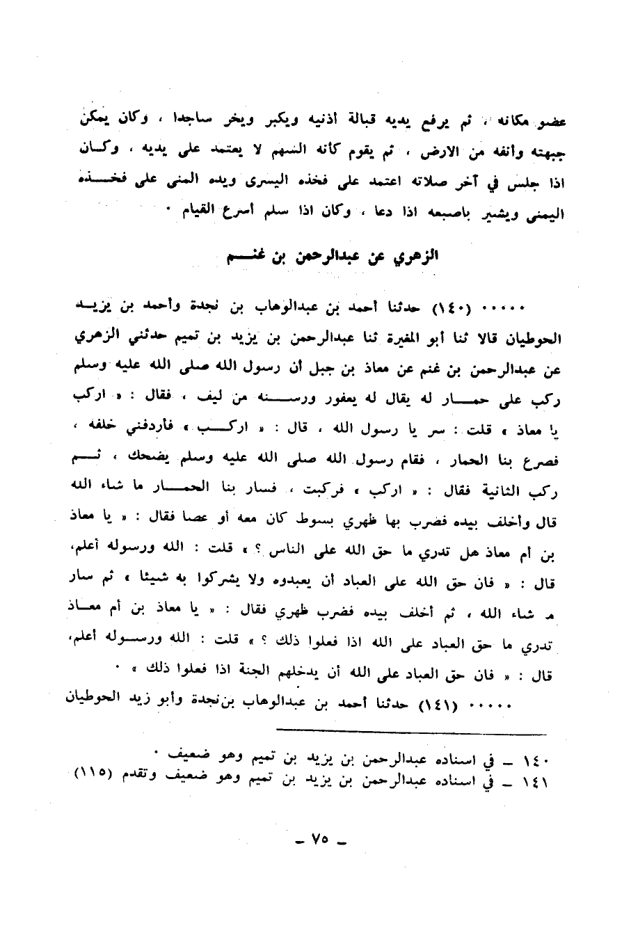 140 - حَدَّثَنَا أَحْمَدُ بْنُ عَبْدِ الْوَهَّابِ بْنِ نَجْدَةَ، وَأَحْمَدُ بْنُ يَزِيدَ الْحُوطِيَّانِ، قَالَا: ثنا أَبُو الْمُغِيرَةِ، ثنا عَبْدُ الرَّحْمَنِ بْنُ يَزِيدَ بْنِ تَمِيمٍ، حَدَّثَنِي الزُّهْرِيُّ، عَنْ عَبْدِ الرَّحْمَنِ بْنِ غَنْمٍ، عَنْ مُعَاذِ بْنِ جَبَلٍ، أَنَّ رَسُولَ اللهِ صَلَّى اللهُ عَلَيْهِ وَسَلَّمَ رَكِبَ عَلَى حِمَارٍ لَهُ يُقَالُ لَهُ: يَعْفُورٌ، وَرَسَنُهُ مِنْ لِيفٍ، فَقَالَ: «ارْكَبْ يَا مُعَاذُ» قُلْتُ: سِرْ يَا رَسُولَ اللهِ، قَالَ: «ارْكَبْ» فَأَرْدَفَنِي خَلْفَهُ، فَصُرِعَ بِنَا الْحِمَارُ، فَقَامَ رَسُولُ اللهِ صَلَّى اللهُ عَلَيْهِ وَسَلَّمَ يَضْحَكُ، ثُمَّ رَكِبَ الثَّانِيَةَ فَقَالَ: «ارْكَبْ» فَرَكِبْتُ، فَسَارَ بِنَا الْحِمَارُ مَا شَاءَ اللهُ، قَالَ: وَأَخْلَفَ بِيَدِهِ فَضَرَبَ بِهَا ظَهْرِي بِسَوْطٍ كَانَ مَعَهُ - أَوْ عَصًا - فَقَالَ: «يَا مُعَاذَ بْنَ أُمِّ مُعَاذٍ، هَلْ تَدْرِي مَا حَقُّ اللهِ عَلَى النَّاسِ؟» قُلْتُ: اللهُ وَرَسُولُهُ أَعْلَمُ، قَالَ: «فَإِنَّ §حَقَّ اللهِ عَلَى الْعِبَادِ أَنْ يَعْبُدُوهُ وَلَا يُشْرِكُوا بِهِ شَيْئًا» ، ثُمَّ سَارَ مَا شَاءَ اللهُ ثُمَّ أَخْلَفَ بِيَدِهِ فَضَرَبَ ظَهْرِي فَقَالَ: «يَا مُعَاذَ بْنَ أُمِّ مُعَاذٍ، تَدْرِي مَا حَقُّ الْعِبَادِ عَلَى اللهِ إِذَا فَعَلُوا ذَلِكَ؟» قُلْتُ: اللهُ وَرَسُولُهُ أَعْلَمُ، قَالَ: «فَإِنَّ حَقَّ الْعِبَادِ عَلَى اللهِ أنْ يُدْخِلَهُمُ الْجَنَّةَ إِذَا فَعَلُوا ذَلِكَ»