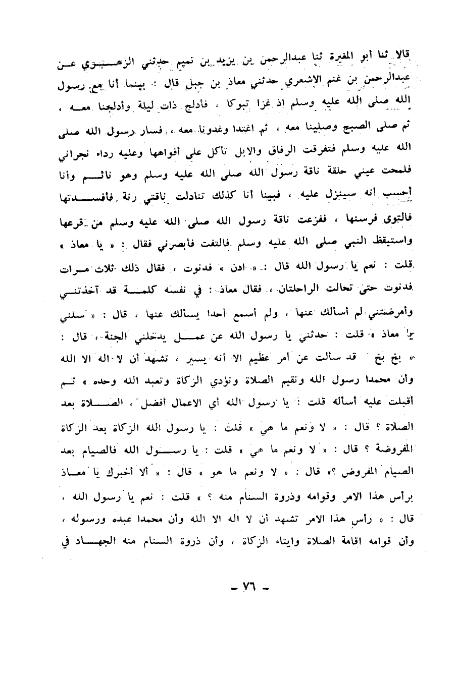 ثُمَّ أَقْبَلْتُ عَلَيْهِ أَسْأَلُهُ، قُلْتُ: يَا رَسُولَ اللهِ أَيُّ الْأَعْمَالِ أَفْضَلُ؟ الصَّلَاةُ بَعْدَ الصَّلَاةِ؟ قَالَ: «لَا، وَنِعْمَ، مَا هِيَ» قُلْتُ: يَا رَسُولَ اللهِ، الزَّكَاةُ بَعْدَ الزَّكَاةِ الْمَفْرُوضَةِ؟ قَالَ: «لَا، وَنِعْمَ، مَا هِيَ» ، قُلْتُ: يَا رَسُولَ اللهِ، فَالصِّيَامُ بَعْدَ الصِّيَامِ الْمَفْرُوضِ؟ قَالَ: «لَا، وَنِعْمَ مَا هُوَ» ، قَالَ: «أَلَا أُخْبِرُكَ يَا مُعَاذُ بِرَأْسِ هَذَا الْأَمْرِ وَقِوَامِهِ وَذُرْوَةِ السَّنَامِ مِنْهُ؟» قُلْتُ: نَعَمْ يَا رَسُولَ اللهِ، قَالَ: «§رَأْسُ هَذَا الْأَمْرِ تَشْهَدُ أَنَّ لَا إِلَهَ إِلَّا اللهُ، وَأَنَّ مُحَمَّدًا عَبْدُهُ وَرَسُولُهُ، وَأَنَّ قِوَامَهُ إِقَامَةُ الصَّلَاةِ، وَإِيتَاءُ الزَّكَاةِ، وَأَنَّ ذِرْوَةَ السَّنَامِ مِنْهُ الْجِهَادُ فِي سَبِيلِ اللهِ، وَالَّذِي نَفْسِي بِيَدِهِ مَا تَغَبَّرَتْ قَدَمَا عَبْدٍ قَطُّ وَلَا وَجْهُهُ فِي عَمِلٍ أَفْضَلَ عِنْدِ اللهِ بَعْدُ» فَذَكَرَ الْحَدِيثَ