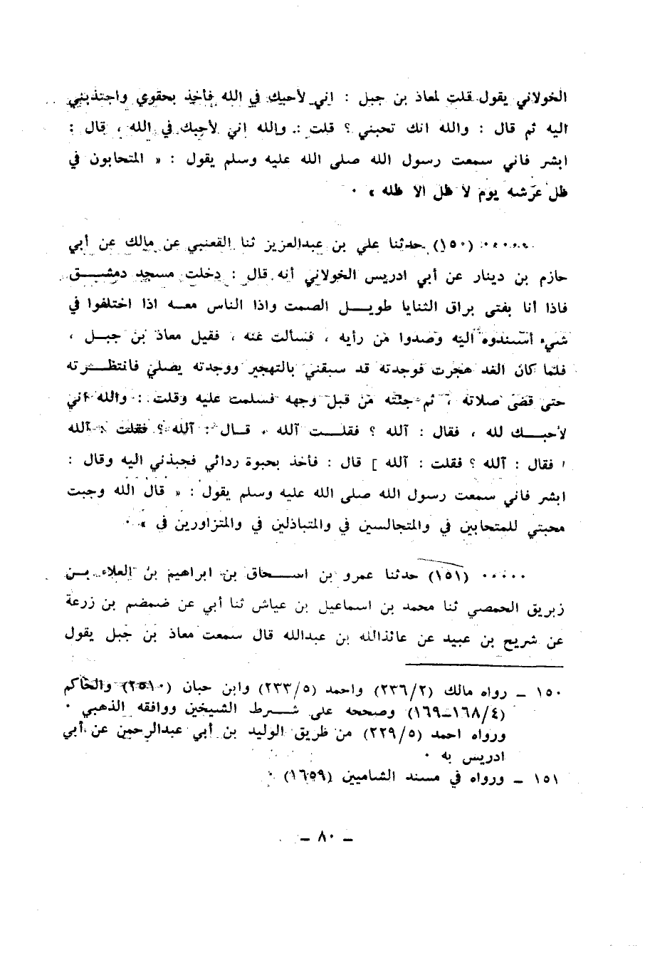 150 - حَدَّثَنَا عَلِيُّ بْنُ عَبْدِ الْعَزِيزِ، ثنا الْقَعْنَبِيُّ، عَنْ مَالِكٍ، عَنْ أَبِي حَازِمِ بْنِ دِينَارٍ، عَنْ أَبِي إِدْرِيسَ الْخَوْلَانِيِّ، أَنَّهُ قَالَ: دَخَلْتُ مَسْجِدَ دِمَشْقَ، فَإِذَا أَنَا بِفَتًى بَرَّاقِ الثَّنَايَا، طَوِيلِ الصَّمْتِ، وَإِذَا النَّاسُ مَعَهُ إِذَا اخْتَلَفُوا فِي شَيْءٍ أَسْنَدُوهُ إِلَيْهِ، وَصَدَرُوا مِنْ رَأْيِهِ، فَسَأَلْتُ عَنْهُ فَقِيلَ: مُعَاذُ بْنُ جَبَلٍ، فَلَمَّا كَانَ الْغَدُ هَجَّرْتُ، فَوَجَدْتُهُ قَدْ سَبَقَنِي بِالتَّهْجِيرِ، وَوَجَدْتُهُ يُصَلِّي، فَانْتَظَرْتُهُ حَتَّى قَضَى صَلَاتَهُ، ثُمَّ جِئْتُهُ مِنْ قِبَلِ وَجْهِهِ فَسَلَّمْتُ عَلَيْهِ، وَقُلْتُ: وَاللهِ إِنِّي لَأُحِبُّكَ لِلَّهِ، فَقَالَ: آللَّهِ؟ فَقُلْتُ: آللَّهِ، قَالَ: آللَّهِ؟ فَقُلْتُ: آللَّهِ، فَقَالَ: آللَّهِ؟ فَقُلْتُ: آللَّهِ، قَالَ: فَأَخَذَ بِحُبْوَةِ رِدَائِي فَجَذَبَنِي إِلَيْهِ، وَقَالَ: أَبْشِرْ، فَإِنِّي سَمِعْتُ رَسُولَ اللهِ صَلَّى اللهُ عَلَيْهِ وَسَلَّمَ يَقُولُ: " قَالَ اللهُ: §وَجَبَتْ مَحَبَّتِي لِلْمُتَحَابِّينَ فِيَّ، وَالْمُتَجَالِسِينَ فِيَّ، وَالْمُتَبَاذِلِينَ فِيَّ، وَالْمُتَزَاوِرِينَ فِيَّ "