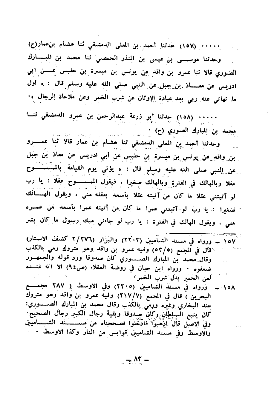 157 - حَدَّثَنَا أَحْمَدُ بْنُ الْمُعَلَّى الدِّمَشْقِيُّ، ثنا هِشَامُ بْنُ عَمَّارٍ، ح وَحَدَّثَنَا مُوسَى بْنُ عِيسَى بْنِ الْمُنْذِرِ الْحِمْصِيُّ، ثنا مُحَمَّدُ بْنُ الْمُبَارَكِ الصُّورِيُّ قَالَا: ثنا عَمْرُو بْنُ وَاقِدٍ، عَنْ يُونُسَ بَنِ مَيْسَرَةَ بْنِ حَلْبَسٍ، عَنْ أَبِي إِدْرِيسَ، عَنْ مُعَاذِ بْنِ جَبَلٍ، عَنِ النَّبِيِّ صَلَّى اللهُ عَلَيْهِ وَسَلَّمَ قَالَ: «§أَوَّلُ مَا نَهَانِي عَنْهُ رَبِّي - بَعْدَ عُبَادَةِ الْأَوْثَانِ - عَنْ شُرْبِ الْخَمْرِ، وَعَنْ مُلَاحَاةِ الرِّجَالِ»