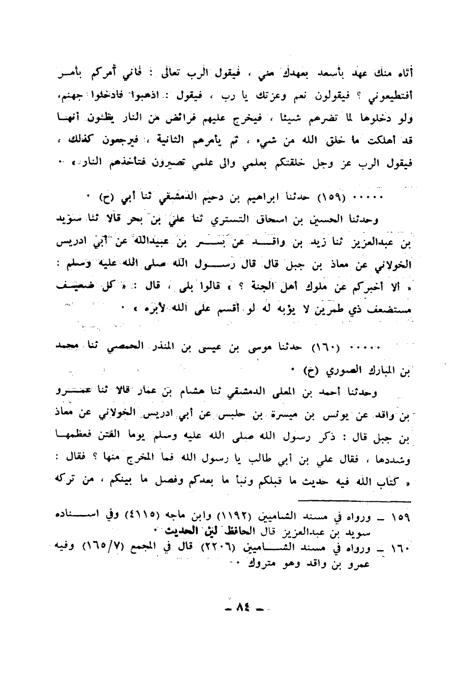 160 - حَدَّثَنَا مُوسَى بْنُ عِيسَى بْنِ الْمُنْذِرِ الْحِمْصِيُّ، ثنا مُحَمَّدُ بْنُ الْمُبَارَكِ الصُّورِيُّ، ح وَحَدَّثَنَا أَحْمَدُ بْنُ الْمُعَلَّى الدِّمَشْقِيُّ، ثنا هِشَامُ بْنُ عَمَّارٍ قَالَا: ثنا عَمْرُو بْنُ وَاقِدٍ، عَنْ يُونُسَ بْنِ مَيْسَرَةَ بْنِ حَلْبَسٍ، عَنْ أَبِي إِدْرِيسَ الْخَوْلَانِيِّ، عَنْ مُعَاذِ بْنِ جَبَلٍ، قَالَ: ذَكَرَ رَسُولُ اللهِ صَلَّى اللهُ عَلَيْهِ وَسَلَّمَ يَوْمًا الْفِتَنَ فَعَظَّمَهَا وَشَدَّدَهَا، فَقَالَ عَلِيُّ بْنُ أَبِي طَالِبٍ: يَا رَسُولَ اللهِ، فَمَا الْمَخْرَجُ مِنهَا؟ فَقَالَ: " §كِتَابُ اللهِ، فِيهِ حَدِيثُ مَا قَبْلَكُمْ، وَنَبَأُ مَا بَعْدَكُمْ، وَفَصْلُ مَا بَيْنَكُمْ، مَنْ تَرَكَهُ مِنْ جَبَّارٍ قَصَمَهُ اللهُ، وَمَنْ تَتَبَّعَ الْهُدَى فِي غَيْرِهِ أَضَلَّهُ اللهُ، هُوَ حَبْلُ اللهِ الْمَتِينُ، وَالذَّكْرُ الْحَكِيمُ، وَالصِّرَاطُ الْمُسْتَقِيمُ، هُوَ الَّذِي لَمَّا سَمِعَتْهُ الْجِنُّ قَالَتْ: {إِنَّا سَمِعْنَا قُرْآنًا عَجَبًا} [الجن: 1] هُوَ الَّذِي لَا تَخْتَلِفُ بِهِ الْأَلْسُنُ، وَلَا تُخْلِقُهُ كَثْرَةُ الرَّدِّ "