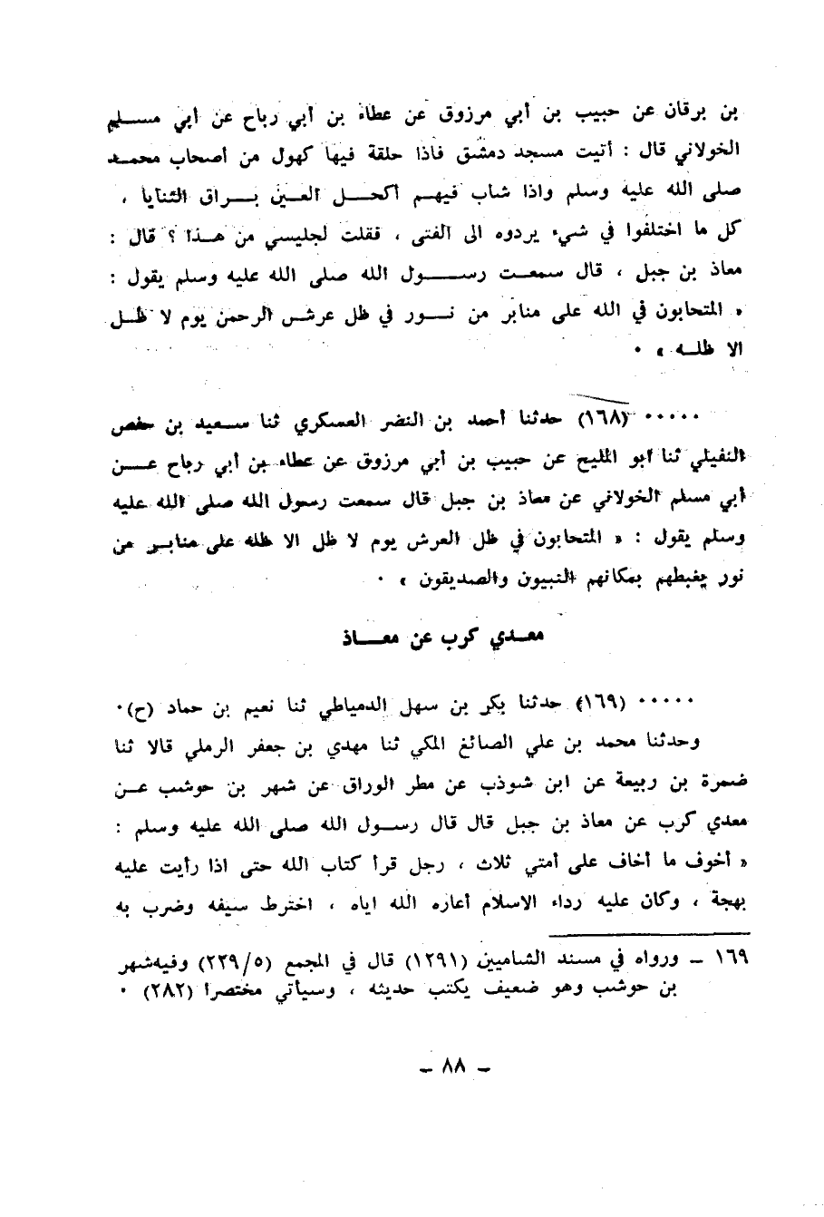 168 - حَدَّثَنَا أَحْمَدُ بْنُ النَّضْرِ الْعَسْكَرِيُّ، ثنا سَعِيدُ بْنُ حَفْصٍ النُّفَيْلِيُّ، ثنا أَبُو الْمَلِيحِ، عَنْ حَبِيبِ بْنِ أَبِي مَرْزُوقٍ، عَنْ عَطَاءِ بْنِ أَبِي رَبَاحٍ، عَنْ أَبِي مُسْلِمٍ الْخَوْلَانِيِّ، عَنْ مُعَاذِ بْنِ جَبَلٍ، قَالَ: سَمِعْتُ رَسُولَ اللهِ صَلَّى اللهُ عَلَيْهِ وَسَلَّمَ يَقُولُ: «§الْمُتَحَابُّونَ فِي ظِلِّ الْعَرْشِ يَوْمَ لَا ظِلَّ إِلَّا ظِلُّهُ، عَلَى مَنَابِرَ مِنْ نُورٍ، يَغْبِطُهُمْ بِمَكَانِهِمُ النَّبِيُّونَ وَالصِّدِّيقُونَ»