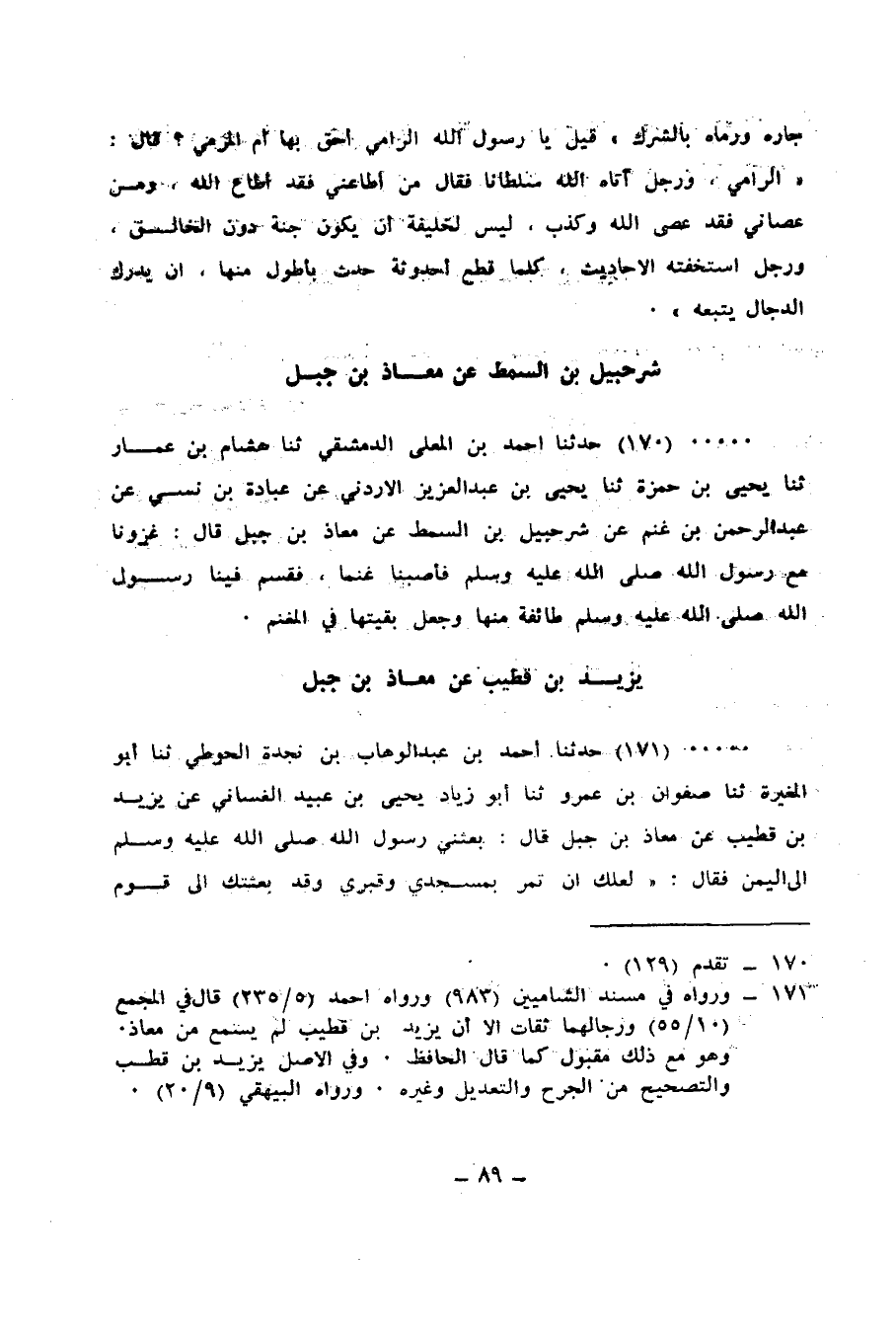 171 - حَدَّثَنَا أَحْمَدُ بْنُ عَبْدِ الْوَهَّابِ بْنِ نَجْدَةَ الْحَوْطِيُّ، ثنا أَبُو الْمُغِيرَةِ، ثنا صَفْوَانُ بْنُ عَمْرٍو، ثنا أَبُو زِيَادٍ يَحْيَى بْنُ عُبَيْدٍ الْغَسَّانِيُّ، عَنْ يَزِيدَ بْنِ قُطَيْبٍ، عَنْ مُعَاذِ بْنِ جَبَلٍ، قَالَ: بَعَثَنِي رَسُولُ اللهِ صَلَّى اللهُ عَلَيْهِ وَسَلَّمَ إِلَى الْيَمَنِ فَقَالَ: «§لَعَلَّكَ أَنْ تَمُرَّ بِمَسْجِدِي وَقَبْرِي، وَقَدْ بَعَثْتُكَ إِلَى قَوْمٍ رُقَيْقَةٌ قُلُوبُهُمْ، يُقَاتِلُونُ عَلَى الْحَقِّ، فَقَاتِلْ بِمَنْ أَطَاعَكَ مِنْهُمْ مَنْ عَصَاكَ، ثُمَّ يَفِيئُونَ إِلَى الْإِسْلَامِ حَتَّى تُبَادِرَ الْمَرْأَةُ زَوْجَهَا، وَالْوَلَدُ والِدَهُ، وَالْأَخُ أَخَاهُ، فَانْزِلْ بَيْنَ الْحَيَّيْنِ السَّكُونِ وَالسَّكَاسِكِ»