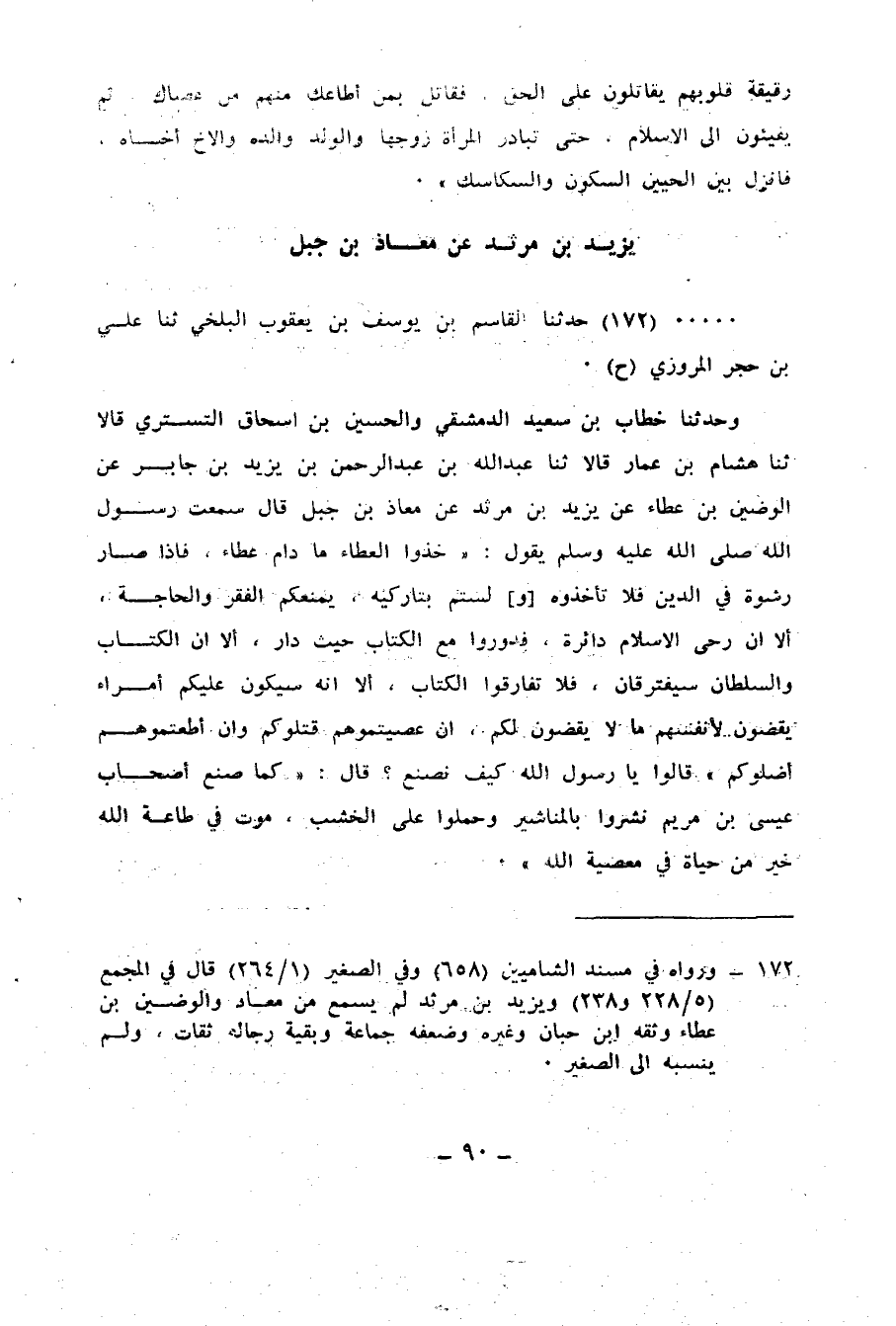 172 - حَدَّثَنَا الْقَاسِمُ بْنُ يُوسُفَ بْنِ يَعْقُوبَ الْبَلْخِيُّ، ثنا عَلِيُّ بْنُ حُجْرٍ الْمَرْوَزِيُّ، ح وَحَدَّثَنَا خَطَّابُ بْنُ سَعِيدٍ الدِّمَشْقِيُّ، وَالْحُسَيْنُ بْنُ إِسْحَاقَ التُّسْتَرِيُّ قَالَا: ثنا هِشَامُ بْنُ عَمَّارٍ قَالَا: ثنا عَبْدُ اللهِ بْنُ عَبْدِ الرَّحْمَنِ بْنِ يَزِيدَ بْنِ جَابِرٍ، عَنِ الْوَضِينِ بْنِ عَطَاءٍ، عَنْ يَزِيدَ بْنِ مَرْثَدٍ، عَنْ مُعَاذِ بْنِ جَبَلٍ، قَالَ: سَمِعْتُ رَسُولَ اللهِ صَلَّى اللهُ عَلَيْهِ وَسَلَّمَ يَقُولُ: «§خُذُوا الْعَطَاءَ مَا دَامَ عَطَاءً، فَإِذَا صَارَ رِشْوَةً فِي الدِّينِ فَلَا تَأْخُذُوهُ، وَلَسْتُمْ بِتَارِكِيهِ، يَمْنَعْكُمُ الْفَقْرَ وَالْحَاجَةَ، أَلَا إِنَّ رَحَى الْإِسْلَامِ دَائِرَةٌ، فَدُورُوا مَعَ الْكِتَابِ حَيْثُ دَارَ، أَلَا إِنَّ الْكِتَابَ وَالسُّلْطَانَ سَيَفْتَرِقَانِ، فَلَا تُفَارِقُوا الْكِتَابَ، أَلَا إِنَّهُ سَيَكُونُ عَلَيْكُمْ أُمَرَاءُ يَقْضُونَ لِأَنْفُسِهِمْ مَا لَا يَقْضُونَ لَكُمْ، إِنْ عَصَيْتُمُوهُمْ قَتَلُوكُمْ، وَإِنْ أَطَعْتُمُوهُمْ أَضَلُّوكُمْ» قَالُوا: يَا رَسُولَ اللهِ، كَيْفَ نَصْنَعُ؟ قَالَ: «كَمَا صَنَعَ أَصْحَابُ عِيسَى ابْنِ مَرْيَمَ، نُشِرُوا بِالْمَنَاشِيرَ، وَحُمِلُوا عَلَى الْخَشَبِ، مَوْتٌ فِي طَاعَةِ اللهِ خَيْرٌ مِنْ حَيَاةٍ فِي مَعْصِيَةِ اللهِ»
