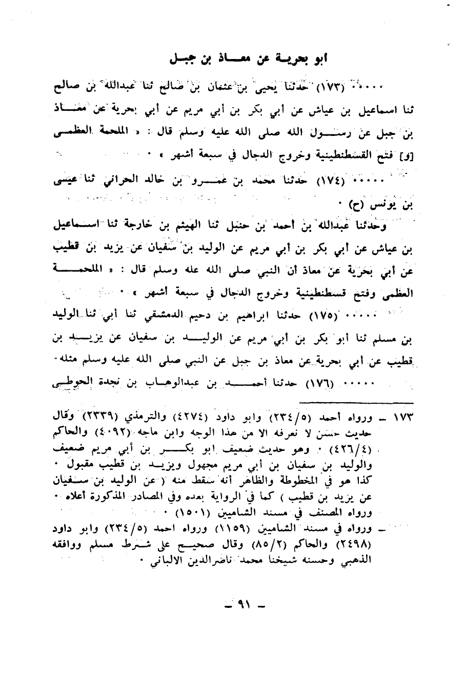 174 - حَدَّثَنَا مُحَمَّدُ بْنُ عَمْرِو بْنِ خَالِدٍ الْحَرَّانِيُّ، ثنا عِيسَى بْنُ يُونُسَ، ح وَحَدَّثَنَا عَبْدُ اللهِ بْنُ أَحْمَدَ بْنِ حَنْبَلٍ، ثنا الْهَيْثَمُ بْنُ خَارِجَةَ، ثنا إِسْمَاعِيلُ بْنُ عَيَّاشٍ، عَنْ أَبِي بَكْرِ بْنِ أَبِي مَرْيَمَ، عَنِ الْوَلِيدِ بْنِ سُفْيَانَ، عَنْ يَزِيدَ بْنِ قُطَيْبٍ، عَنْ أَبِي بَحْرِيَّةَ، عَنْ مُعَاذٍ، أَنَّ النَّبِيَّ صَلَّى اللهُ عَلَيْهِ وَسَلَّمَ قَالَ: «§الْمَلْحَمَةُ الْعُظْمَى، وَفَتْحُ قُسْطَنْطِينِيَّةَ، وَخُرُوجُ الدَّجَّالِ فِي سَبْعَةِ أَشْهُرٍ»