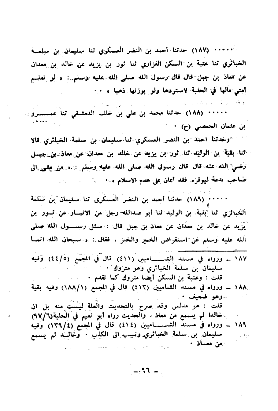 188 - حَدَّثَنَا مُحَمَّدُ بْنُ عَلِيِّ بْنِ خَلَفٍ الدِّمَشْقِيُّ، ثنا عَمْرُو بْنُ عُثْمَانَ الْحِمْصِيُّ، ح وَحَدَّثَنَا أَحْمَدُ بْنُ النَّضْرِ الْعَسْكَرِيُّ، ثنا سُلَيْمَانُ بْنُ سَلَمَةَ الْخَبَائِرِيُّ قَالَا، ثنا بَقِيَّةُ بْنُ الْوَلِيدِ، ثنا ثَوْرُ بْنُ يَزِيدَ، عَنْ خَالِدِ بْنِ مَعْدَانَ، عَنْ مُعَاذِ بْنِ جَبَلٍ رَضِيَ اللهُ عَنْهُ، قَالَ: قَالَ رَسُولُ اللهِ صَلَّى اللهُ عَلَيْهِ وَسَلَّمَ: «§مَنْ مَشَى إِلَى صَاحِبِ بِدْعَةٍ لِيُوَقِّرَهُ فَقَدْ أَعَانَ عَلَى هَدْمِ الْإِسْلَامِ»