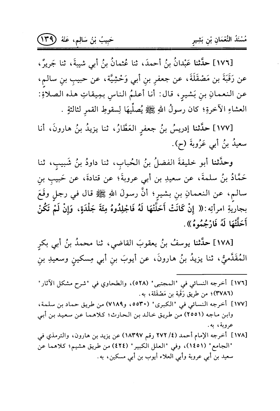 178 - حدَّثنا يوسفُ بنُ يعقوبَ القاضي، ثنا محمدُ بنُ أبي بكرٍ المُقَدَّميُّ، ثنا يزيدُ بنُ هارونَ، عن أيوبَ بنِ أبي مِسكينٍ وسعيدِ بنِ -[140]- أبي عَروبةَ، عن قتادةَ، عن حَبيبِ بنِ سالمٍ، عن النعمانِ بنِ بَشيرٍ، عن النبيِّ صلى الله عليه وسلم، مثلَه.