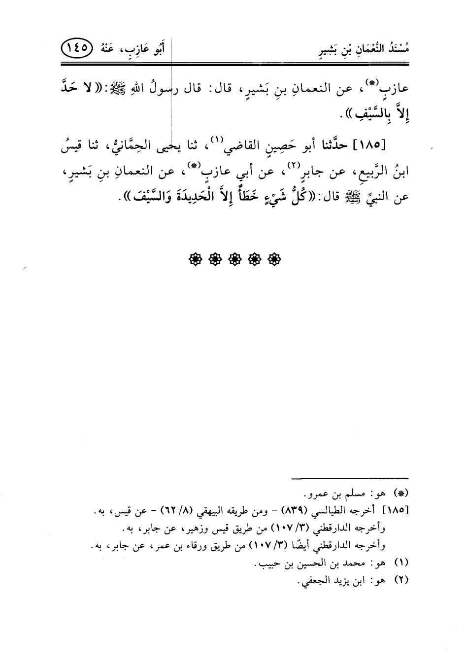185 - حدَّثنا أبو حَصِينٍ القاضي (¬1) ، ثنا يحيى الحِمَّانيُّ، ثنا قيسُ ابنُ الرَّبيعِ، عن جابرٍ (¬2) ، عن أبي عازبٍ (¬3) ، عن النعمانِ بنِ بَشيرٍ، عن النبيِّ صلى الله عليه وسلم قال: «كُلُّ شَيْءٍ خَطَأٌ إِلاَّ الْحَدِيدَةَ وَالسَّيْفَ» .