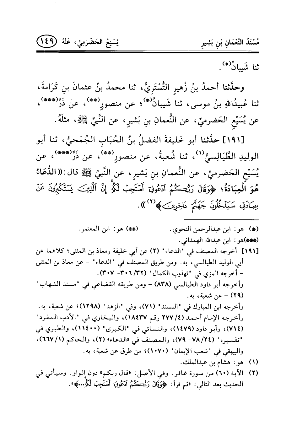 191 - حدَّثنا أبو خَليفةَ الفضلُ بنُ الحُبَابِ الجُمَحيُّ، ثنا أبو الوليدِ الطَّيَالِسيُّ (¬1) ، ثنا شُعبةُ، عن منصورٍ (¬2) ، عن ذَرٍّ (¬3) ، عن يُسَيْعٍ الحَضرميِّ، عن النُّعمانِ بنِ بَشيرٍ، عن النَّبيِّ صلى الله عليه وسلم قال: «الدُّعَاءُ هُوَ الْعِبَادَةُ؛ {وَقَالَ رَبُّكُمُ ادْعُونِي أَسْتَجِبْ لَكُمْ إِنَّ الَّذِينَ يَسْتَكْبِرُونَ عَنْ عِبَادَتِي سَيَدْخُلُونَ جَهَنَّمَ دَاخِرِينَ *} (¬4) » .