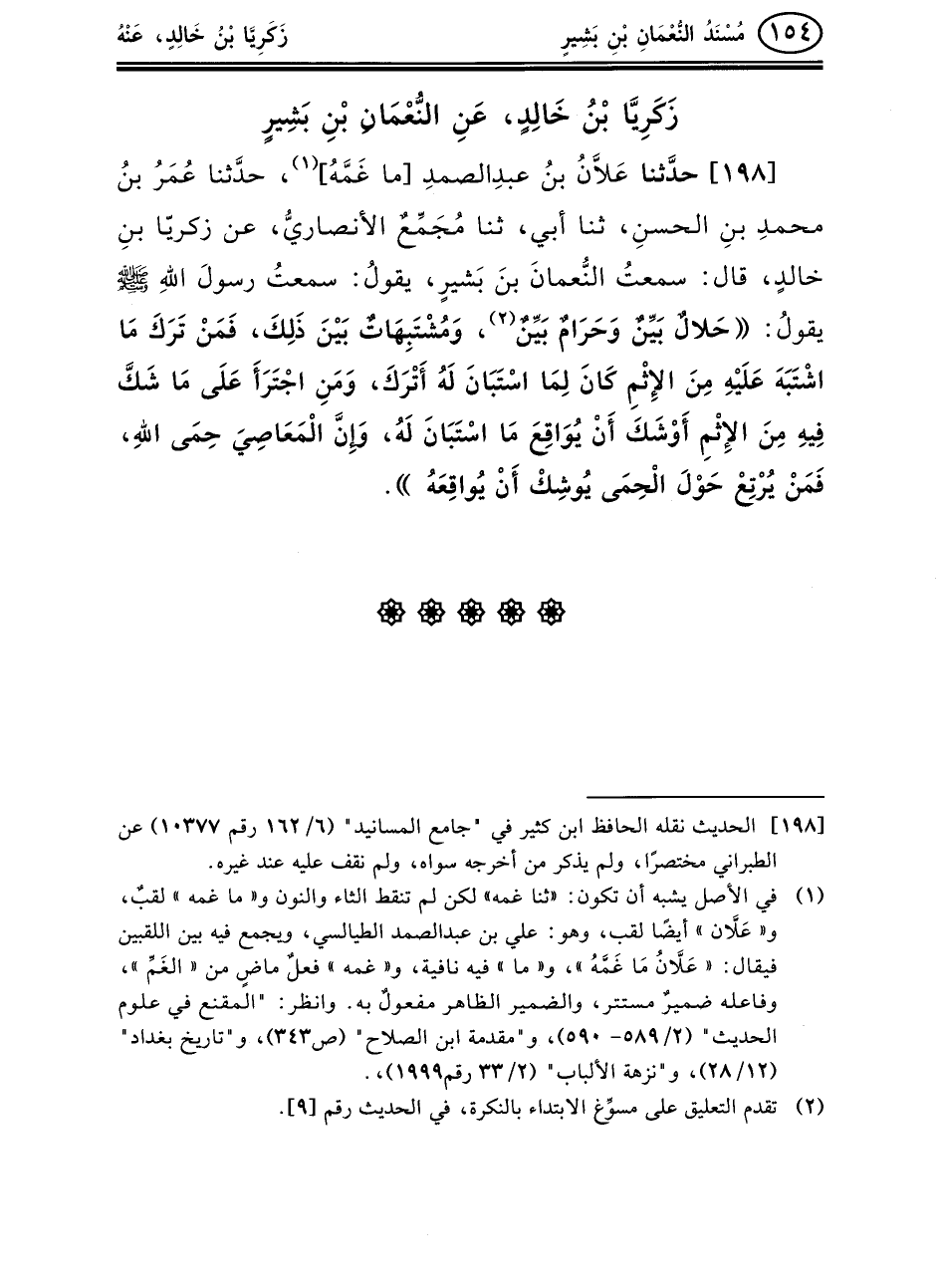 198 - حدَّثنا عَلاَّنُ بنُ عبدِالصمدِ [ما غَمَّهُ] (¬1) ، حدَّثنا عُمَرُ بنُ محمدِ بنِ الحسنِ، ثنا أبي، ثنا مُجَمِّعٌ الأنصاريُّ، عن زكريّا بنِ خالدٍ، قال: سمعتُ النُّعمانَ بنَ بَشيرٍ، يقولُ: سمعتُ رسولَ اللهِ صلى الله عليه وسلم يقولُ: «حَلالٌ بَيِّنٌ وَحَرَامٌ بَيِّنٌ (¬2) ، وَمُشْتَبِهَاتٌ بَيْنَ ذَلِكَ، فَمَنْ تَرَكَ مَا اشْتَبَهَ عَلَيْهِ مِنَ الإِثْمِ كَانَ لِمَا اسْتَبَانَ لَهُ أَتْرَكَ، وَمَنِ اجْتَرَأَ عَلَى مَا شَكَّ فِيهِ مِنَ الإِثْمِ أَوْشَكَ أَنْ يُوَاقِعَ مَا اسْتَبَانَ لَهُ، وَإِنَّ الْمَعَاصِيَ حِمَى اللهِ، فَمَنْ يُرْتِعْ حَوْلَ الْحِمَى يُوشِكْ أَنْ يُواقِعَهُ» .