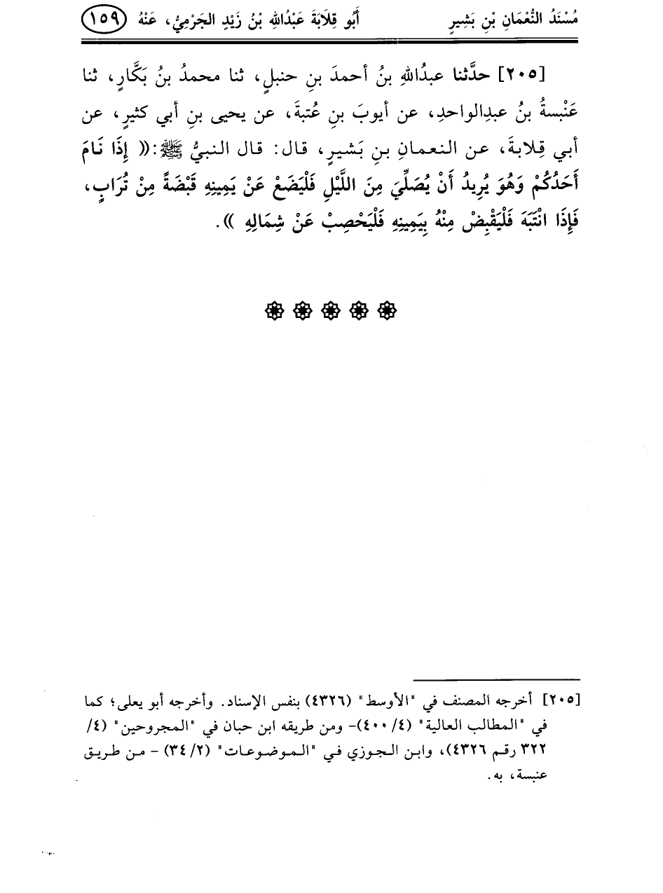 205 - حدَّثنا عبدُاللهِ بنُ أحمدَ بنِ حنبلٍ، ثنا محمدُ بنُ بَكَّارٍ، ثنا عَنْبسةُ بنُ عبدِالواحدِ، عن أيوبَ بنِ عُتبةَ، عن يحيى بنِ أبي كثيرٍ، عن أبي قِلابةَ، عن النعمانِ بنِ بَشيرٍ، قال: قال النبيُّ صلى الله عليه وسلم: «إِذَا نَامَ أَحَدُكُمْ وَهُوَ يُرِيدُ أَنْ يُصَلِّيَ مِنَ اللَّيْلِ فَلْيَضَعْ عَنْ يَمِينِهِ قَبْضَةً مِنْ تُرَابٍ، فَإِذَا انْتَبَهَ فَلْيَقْبِضْ مِنْهُ بِيَمِينِهِ فَلْيَحْصِبْ عَنْ شِمَالِهِ» .