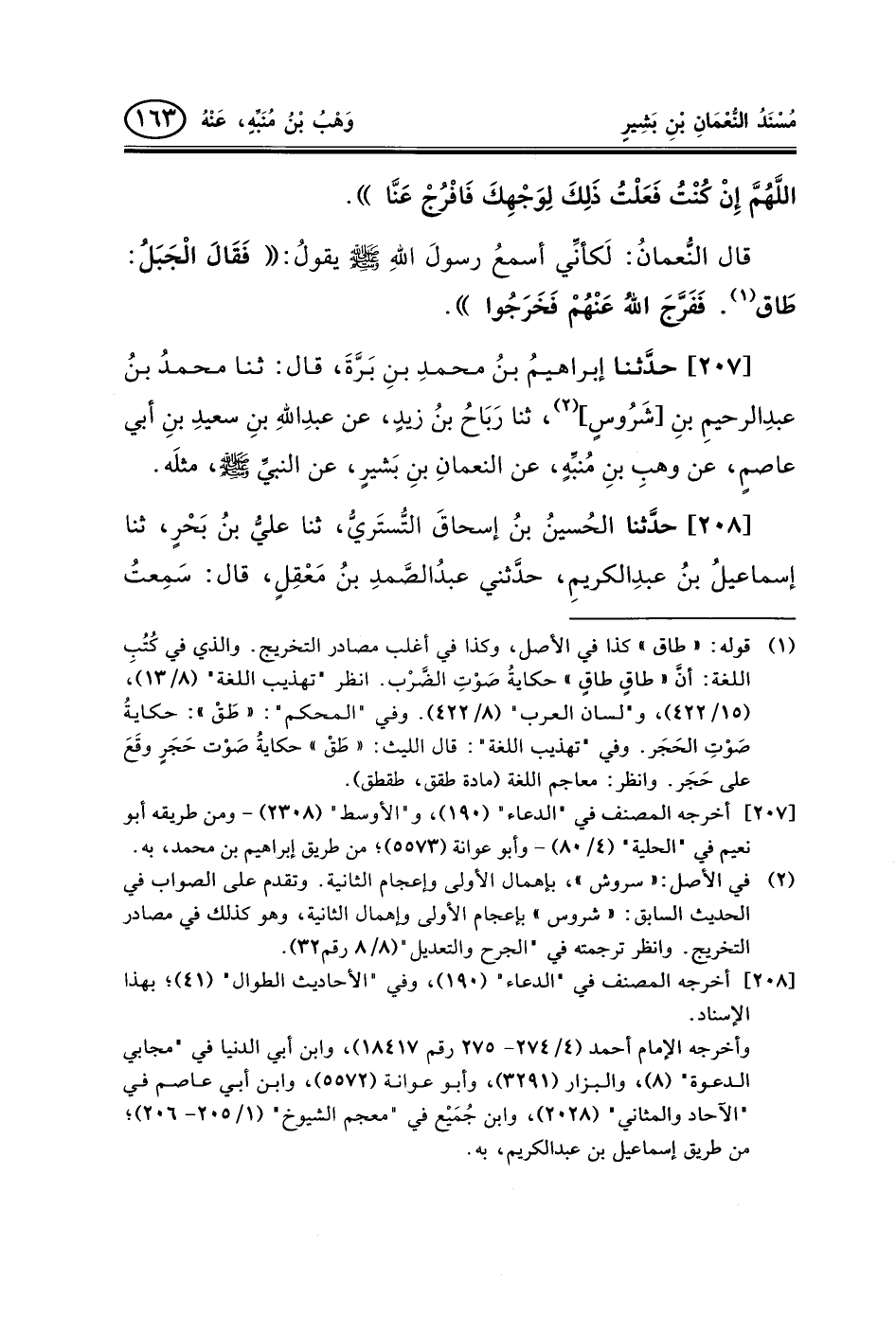 207 - حدَّثنا إبراهيمُ بنُ محمدِ بنِ بَرَّةَ، قال: ثنا محمدُ بنُ عبدِالرحيمِ بنِ [شَرُوسٍ] (¬1) ، ثنا رَبَاحُ بنُ زيدٍ، عن عبدِاللهِ بنِ سعيدِ بنِ أبي عاصمٍ، عن وهبِ بنِ مُنبِّهٍ، عن النعمانِ بنِ بَشيرٍ، عن النبيِّ صلى الله عليه وسلم، مثلَه.