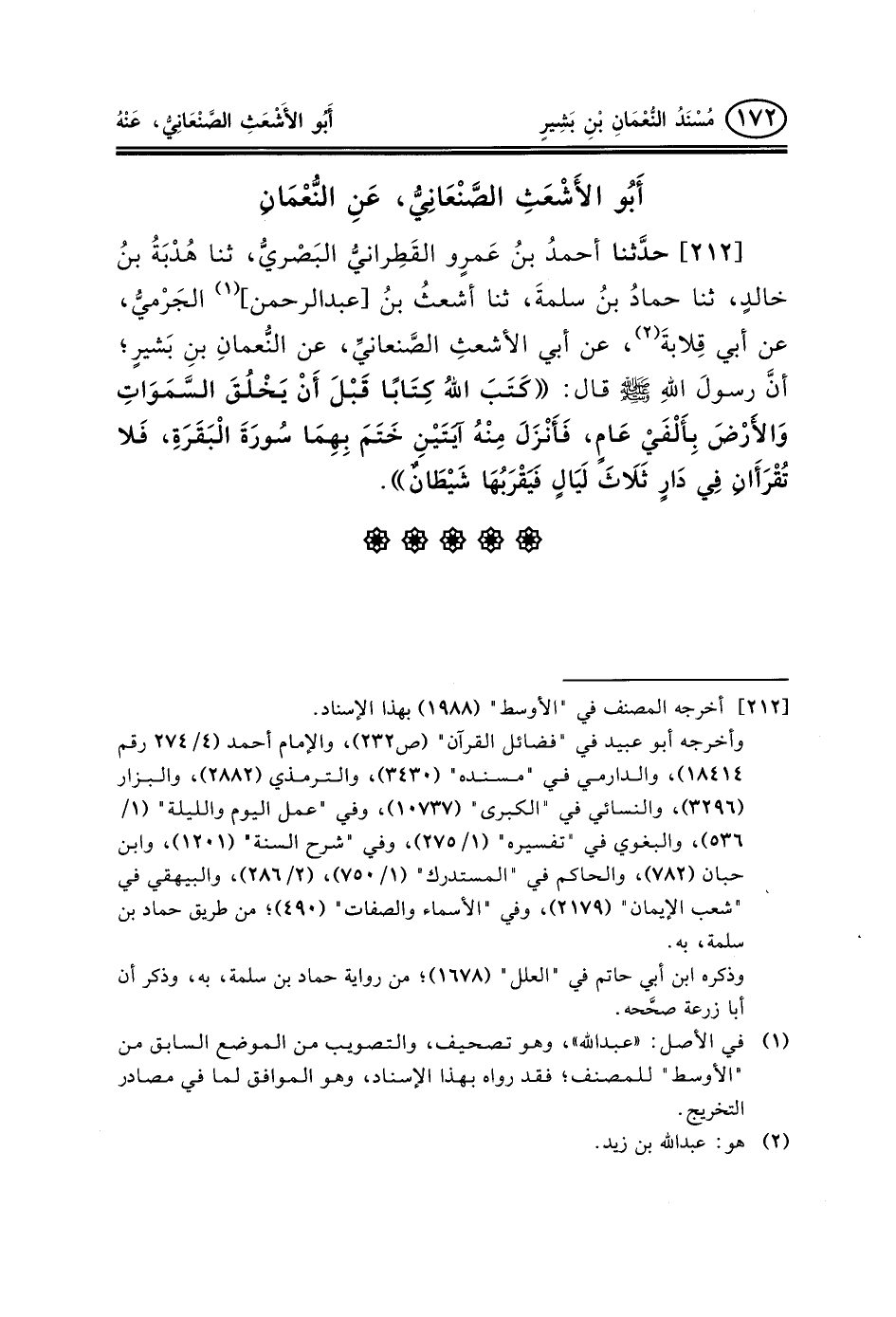 212 - حدَّثنا أحمدُ بنُ عَمرٍو القَطِرانيُّ البَصْريُّ، ثنا هُدْبَةُ بنُ خالدٍ، ثنا حمادُ بنُ سلمةَ، ثنا أشعثُ بنُ [عبد الرحمن] (¬1) الجَرْميُّ، عن أبي قِلابةَ (¬2) ، عن أبي الأشعثِ الصَّنعانيِّ، عن النُّعمانِ بنِ بَشيرٍ؛ أنَّ رسولَ اللهِ صلى الله عليه وسلم قال: «كَتَبَ اللهُ كِتَابًا قَبْلَ أَنْ يَخْلُقَ السَّمَوَاتِ وَالأَرْضَ بِأَلْفَيْ عَامٍ، فَأَنْزَلَ مِنْهُ آيَتَيْنِ خَتَمَ بِهِمَا سُورَةَ الْبَقَرَةِ، فَلا تُقْرَأَانِ فِي دَارٍ ثَلاَثَ لَيَالٍ فَيَقْرَبُهَا شَيْطَانٌ» .