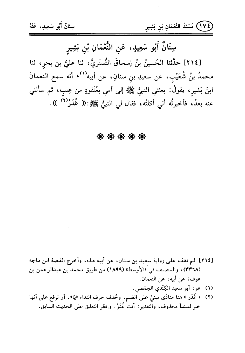 214 - حدَّثنا الحُسينُ بنُ إسحاقَ التُّستَريُّ، ثنا عليُّ بن بحرٍ، ثنا محمدُ بنُ شُعَيْبٍ، عن سعيدِ بنِ سنانٍ، عن أبيه (¬1) ؛ أنه سمع النعمانَ ابنَ بَشيرٍ، يقولُ: بعثني النبيُّ صلى الله عليه وسلم إلى أمي بعُنْقودٍ من عِنبٍ، ثم سألني عنه بعدُ، فأخبرتُه أني أكلتُه، فقال لي النبيُّ صلى الله عليه وسلم: «غُدَرُ (¬2) » .