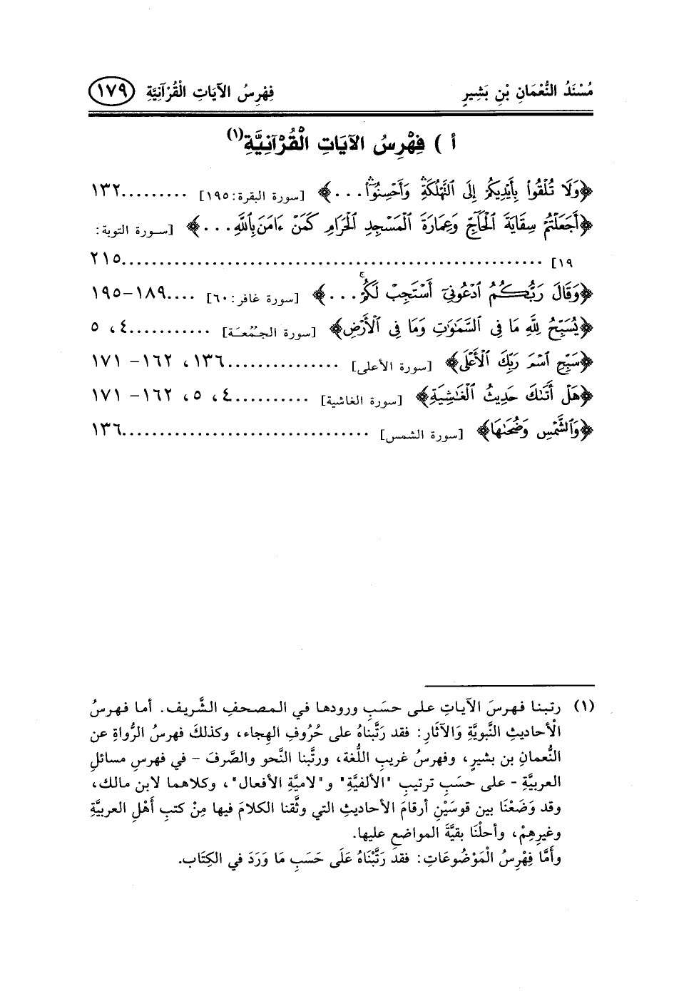 (¬1) رتبنا فهرسَ الآياتِ على حسَبِ ورودها في المصحفِ الشَّريف. أما فهرسُ الأْحاديثِ النَّبويَّةِ وَالآثَارِ: فقد رَتَّبناهُ على حُرُوفِ الهِجاء، وكذلكَ فهرسُ الرُّواةِ عن النُّعمانِ بن بشيرٍ، وفهرسُ غريبِ اللُّغة، ورتَّبنا النَّحو والصَّرفَ- في فهرسِ مسائلِ العربيَّةِ- على حسَبِ ترتيبِ "الألفيَّةِ" و"لاميَّةِ الأفعال"، وكلاهما لابن مالك، وقد وَضَعْنَا بين قوسَيْنِ أرقامَ الأحاديثِ التي وثَّقنا الكلامَ فيها مِنْ كتبِ أَهْلِ العربيَّةِ وغيرِهِمْ، وأحلْنَا بقيَّةَ المواضعِ عليها.