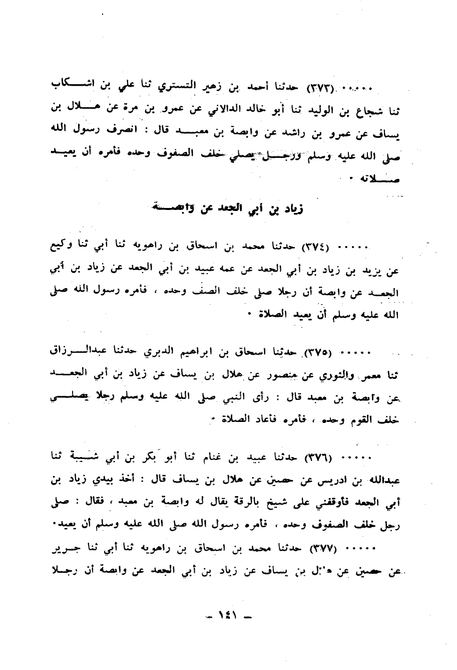 377 - حَدَّثَنَا مُحَمَّدُ بْنُ إِسْحَاقَ بْنِ رَاهَوَيْهِ، ثنا أَبِي، ثنا جَرِيرٌ، عَنْ حُصَيْنٍ، عَنْ هِلَالِ بْنِ يَسَافٍ، عَنْ زِيَادِ بْنِ أَبِي الْجَعْدِ، عَنْ وَابِصَةَ: «أَنَّ §رَجُلًا صَلَّى خَلْفَ الصُّفُوفِ وَحْدَهُ فَأَمَرَهُ رَسُولُ اللهِ صَلَّى اللهُ عَلَيْهِ وَسَلَّمَ أَنْ يُعِيدَ الصَّلَاةَ»
