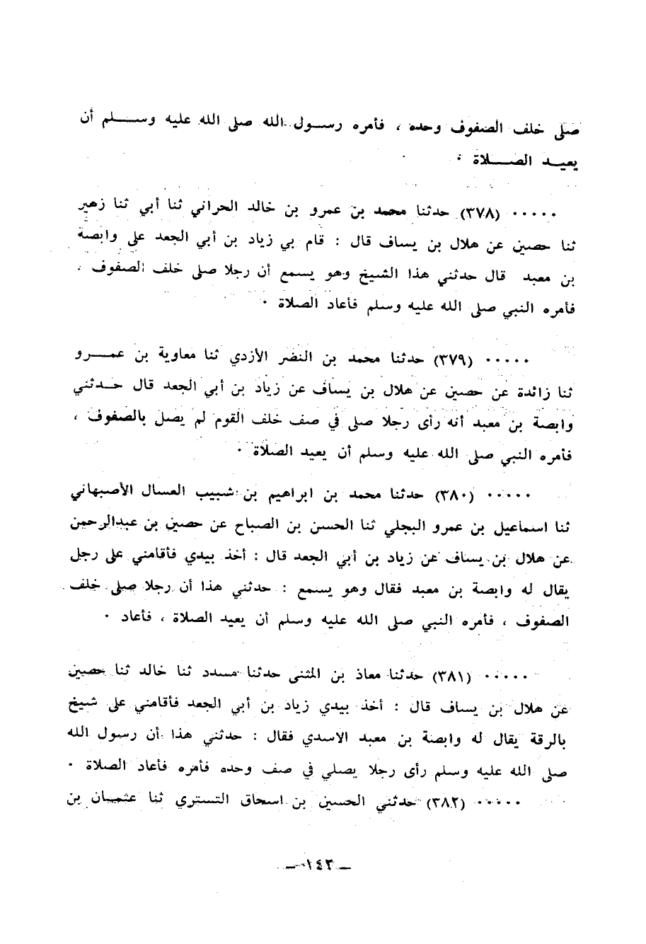 381 - حَدَّثَنَا مُعَاذُ بْنُ الْمُثَنَّى، حَدَّثَنَا مُسَدَّدٌ، ثنا خَالِدٌ، ثنا حُصَيْنٌ، عَنْ هِلَالِ بْنِ يَسَافٍ، قَالَ: أَخَذَ بِيَدِي زِيَادُ بْنُ أَبِي الْجَعْدِ فَأَقَامَنِي عَلَى شَيْخٍ بِالرَّقَّةِ يُقَالُ لَهُ وَابِصَةُ بْنُ مَعْبَدٍ الْأَسَدِيُّ فَقَالَ: حَدَّثَنِي هَذَا أَنَّ رَسُولَ اللهِ صَلَّى اللهُ عَلَيْهِ وَسَلَّمَ «§رَأَى رَجُلًا يُصَلِّي فِي صَفٍّ وَحْدَهُ فَأَمَرَهُ فَأَعَادَ الصَّلَاةَ»