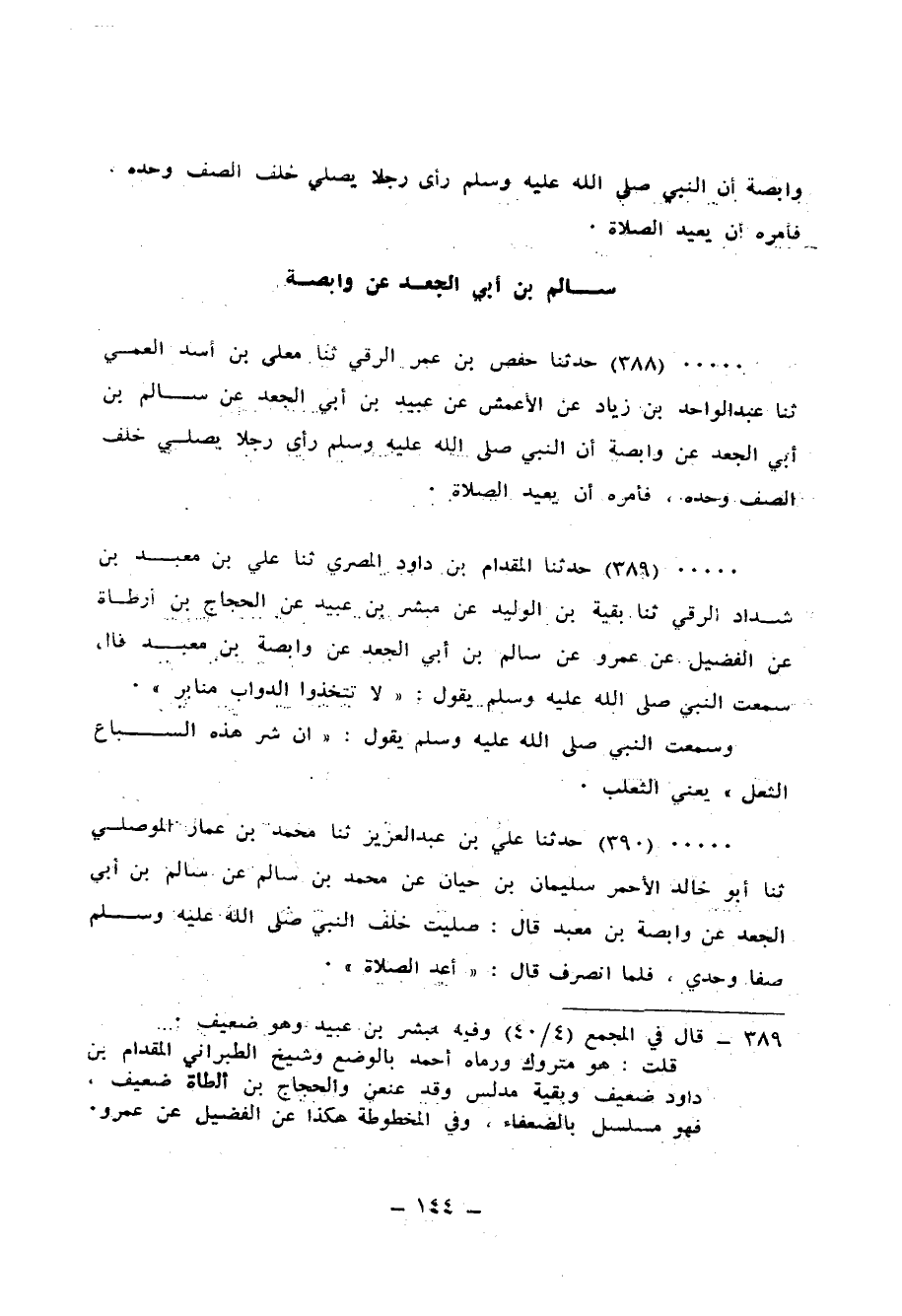 388 - حَدَّثَنَا حَفْصُ بْنُ عُمَرَ الرَّقِّيُّ، ثنا مُعَلَّى بْنُ أَسَدٍ الْعَمِّيُّ، ثنا عَبْدُ الْوَاحِدِ بْنُ زِيَادٍ، عَنِ الْأَعْمَشِ، عَنْ عُبَيْدِ بْنِ أَبِي الْجَعْدِ، عَنْ سَالِمِ بْنِ أَبِي الْجَعْدِ، عَنْ وَابِصَةَ: أَنَّ النَّبِيَّ صَلَّى اللهُ عَلَيْهِ وَسَلَّمَ «§رَأَى رَجُلًا يُصَلِّي خَلْفَ الصَّفِّ وَحْدَهُ فَأَمَرَهُ أَنْ يُعِيدَ الصَّلَاةَ»