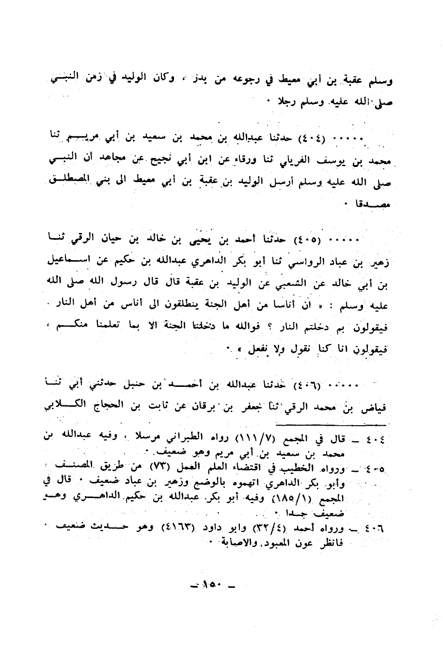 405 - حَدَّثَنَا أَحْمَدُ بْنُ يَحْيَى بْنُ خَالِدِ بْنِ حَيَّانَ الرَّقِّيُّ، ثنا زُهَيْرُ بْنُ عَبَّادٍ الرُّوَاسِيُّ، ثنا أَبُو بَكْرٍ الدَّاهِرِيُّ عَبْدُ اللهِ بْنُ حَكِيمٍ، عَنْ إِسْمَاعِيلَ بْنِ أَبِي خَالِدٍ، عَنِ الشَّعْبِيِّ، عَنِ الْوَلِيدِ بْنِ عُقْبَةَ قَالَ: قَالَ رَسُولُ اللهِ صَلَّى اللهُ عَلَيْهِ وَسَلَّمَ: " إِنَّ §أُنَاسًا مِنْ أَهْلِ الْجَنَّةِ يَنْطَلِقُونَ إِلَى أُنَاسٍ مِنْ أَهْلِ النَّارِ، فَيَقُولُونَ: بِمَ دَخَلْتُمُ النَّارَ فَوَاللهِ مَا دَخَلْنَا الْجَنَّةَ إِلَّا بِمَا تَعَلَّمْنَا مِنْكُمْ؟ فَيَقُولُونَ، إِنَّا كُنَّا نَقُولُ وَلَا نَفْعَلُ "