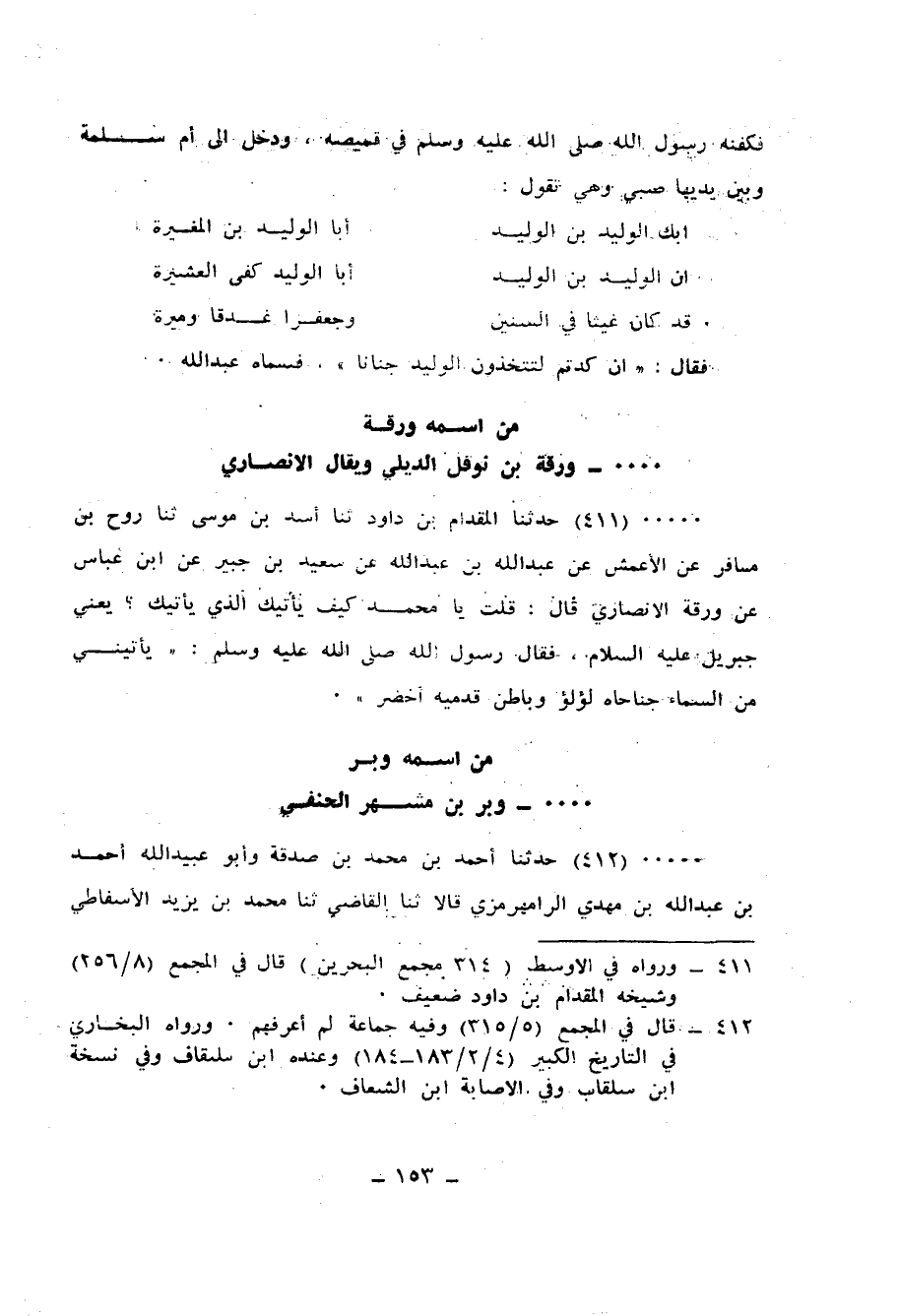411 - حَدَّثَنَا الْمِقْدَامُ بْنُ دَاوُدَ، ثنا أَسَدُ بْنُ مُوسَى، ثنا رَوْحُ بْنُ مُسَافِرٍ، عَنِ الْأَعْمَشِ، عَنْ عَبْدِ اللهِ بْنِ عَبْدِ اللهِ، عَنْ سَعِيدِ بْنِ جُبَيْرٍ، عَنِ ابْنِ عَبَّاسٍ، عَنْ ورَقَةَ الْأَنْصَارِيِّ قَالَ: قُلْتُ: يَا مُحَمَّدُ، كَيْفَ يَأْتِيكَ الَّذِي يَأْتِيكَ؟ يَعْنِي جِبْرِيلَ عَلَيْهِ السَّلَامُ فَقَالَ رَسُولُ اللهِ صَلَّى اللهُ عَلَيْهِ وَسَلَّمَ: «§يَأْتِينِي مِنَ السَّمَاءِ جَنَاحَاهُ لُؤْلُؤٌ وَبَاطِنُ قَدَمَيْهِ أَخْضَرُ»