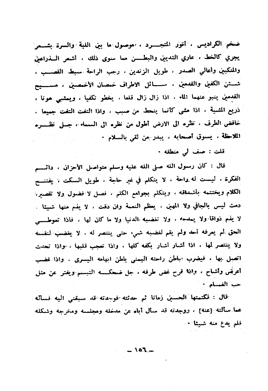 يَجْرِي كالْخَطِّ ، عَارِيَ الثَّدْيَيْنِ وَالْبَطْنِ مِمَّا سِوَى ذَلِكَ ، أَشْعُرَ الذِّرَاعَيْنِ وَالْمَنْكِبَيْنِ وأَعَالِي الصَّدْرِ ، طَوِيلَ الزَّنْدَيْنِ ، رَحْبَ الرَّاحَةِ سَبْطَ الْقَصَبِ ، شَثْنَ الْكَفَّيْنِ وَالْقَدَمَيْنِ ، سَائِلَ الأَطْرَافِ ، خُمْصَانَ الأَخْمَصَيْنِ ، مَسِيحَ الْقَدَمَيْنِ يَنْبُو عَنْهُمَا الْمَاءُ ، إِذَا زَالَ زَالَ قُلْعًا يَخْطُو تَكَفِّيًا وَيَمْشِي هَوْنًا ، ذَرِيعَ الْمِشْيَةِ إِذَا مَشَى كَأَنَّمَا يَنْحَطُّ مِنْ صَبَبٍ ، وَإِذَا الْتَفَتَ الْتَفَتَ جَمِيعًا خَافِضَ الطَّرْفِ ، نَظَرُهُ إِلَى الأَرْضِ أَطْوَلُ مِنْ نَظَرِهِ إِلَى السَّمَاءِ ، جُلُّ نَظَرِهِ الْمُلاَحَظَةُ يَسُوقُ أَصْحَابَهُ ، يَبْدُرُ مَنْ لَقِيَ بِالسَّلاَمِ قُلْتُ : صِفْ لِي مَنْطِقَهُ قَالَ : كَانَ رَسُولُ اللهِ صَلَّى اللَّهُ عَلَيْهِ وَسَلَّمَ مُتَوَاصِلَ الأَحْزَانِ ، دَائِمَ الْفِكْرَةِ ، لَيْسَتْ لَهُ رَاحَةٌ لاَ يَتَكَلَّمُ فِي غَيْرِ حَاجَةٍ ، طَوِيلَ السِّكَّةِ ، يَفْتَتِحُ الْكَلاَمَ وَيَخْتَتِمُهُ بِأَشْدَاقِهِ ، وَيَتَكَلَّمُ بِجَوَامِعِ الْكَلِمِ ، فَصْلٌ لاَ فُضُولَ وَلاَ تَقْصِيرَ ، دَمِثَ لَيْسَ بِالْجَافِي ، وَلاَ الْمُهِينِ يُعَظِّمُ النِّعْمَةَ ، وَإِنْ دَقَّتْ لاَ يَذِمُّ مِنْهَا شَيْئًا لاَ يَذِمُّ ذَوَّاقًا ، وَلاَ يَمْدَحُهُ وَلاَ تُغْضِبُهُ الدُّنْيَا ، وَلاَ مَا كَانَ لَهَا فَإِذَا تُعُوطِيَ الْحَقَّ لَمْ يَعْرِفْهُ أَحَدٌ ، وَلَمْ يَقُمْ لِغَضَبِهِ شَيْءٌ حَتَّى يَنْتَصِرَ لَهُ ، لاَ يَغْضَبُ لِنَفْسِهِ ، وَلاَ يَنْتَصِرُ لَهَا ، إِذَا أَشَارَ أَشَارَ بِكَفِّهِ كُلِّهَا ، وَإِذَا تَعَجَّبَ قَلَبَهَا ، وَإِذَا تَحَدَّثَ اتَّصَلَ بِهَا فَيَضْرِبُ بِبَاطِنِ رَاحَتِهِ الْيُمْنَى بَاطِنَ إِبْهَامَهِ الْيُسْرَى ، وَإِذَا غَضِبَ أَعْرَضَ وَأَشَاحَ ، وَإِذَا فَرِحَ غَضَّ طَرْفَهُ جُلُّ ضَحِكِهِ التَّبَسُّمِ ، وَيَفْتُرُ عَنْ مِثْلِ حَبِّ الْغَمَامِ قَالَ : فَكَتَمْتُهَا الْحُسَيْنَ زَمَانًا ، ثُمَّ حَدَّثْتُهُ فَوَجَدْتُهُ قَدْ سَبَقَنِي إِلَيْهِ ، فَسَأَلَهُ عَمَّا سَأَلْتُهُ عَنْهُ وَوَجَدْتُهُ قَدْ سَأَلَ أَبَاهُ عَنْ مَدْخَلِهِ وَمَجْلِسِهِ وَمَخْرَجِهِ وَشَكْلِهِ فَلَمْ يَدَعْ مِنْهُ شَيْئًا ،