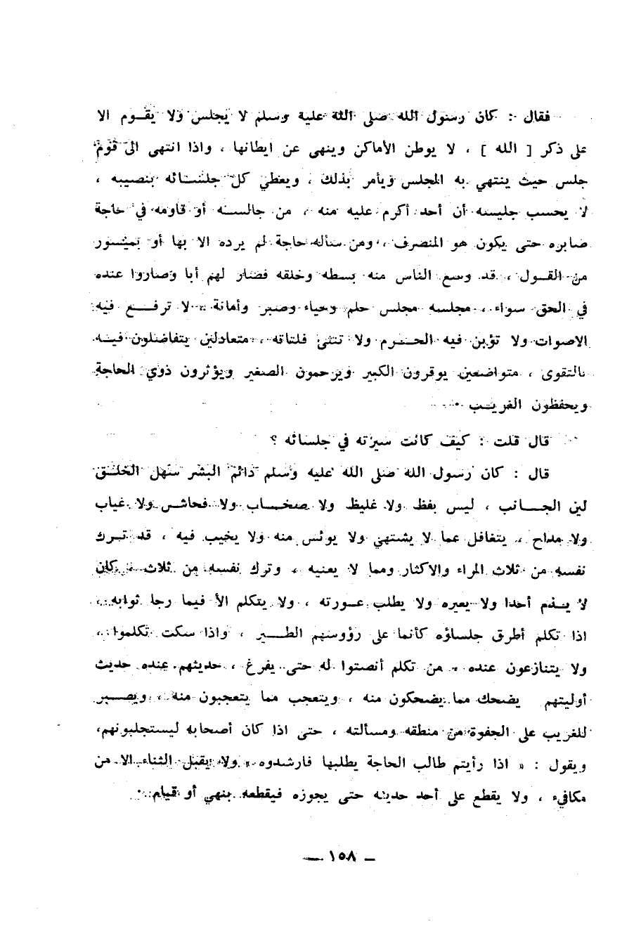فَقَالَ : كَانَ رَسُولُ اللهِ صَلَّى اللَّهُ عَلَيْهِ وَسَلَّمَ لاَ يَجْلِسُ وَلاَ يَقُومُ إِلاَّ عَلَى ذِكْرِ اللهِ لاَ يُوَطِّنُ الأَمَاكِنَ وَيَنْهَى عَنْ إِيطَانِهَا وَإِذَا انْتَهَى إِلَى قَوْمٍ جَلَسَ حَيْثُ يَنْتَهِي بِهِ الْمَجْلِسُ وَيَأْمُرُ بِذَلِكَ وَيُعْطِي كُلَّ جُلَسَائِهِ بِنَصِيبِهِ لاَ يَحْسِبُ جَلِيسُهُ أَنَّ أَحَدًا أَكْرَمُ عَلَيْهِ مِنْهُ مَنْ جَالَسَهُ ، أَوْ قَاوَمَهُ فِي حَاجَةٍ صَابِرَهُ حَتَّى يَكُونَ هُوَ الْمُنْصَرِفُ وَمَنْ سَأَلَهُ حَاجَةً لَمْ يَرُدَّهُ إِلاَّ بِهَا ، أَوْ بِمَيْسُورٍ مِنَ الْقَوْلِ قَدْ وَسِعَ النَّاسَ مِنْهُ بَسْطُهُ وَخُلُقُهُ فَصَارَ لَهُمْ أَبًا ، وَصَارُوا عِنْدَهُ فِي الْحَقِّ سَوَاءً ، مَجْلِسُهُ مَجْلِسُ حِلْمٍ وَحَيَاءٍ وَصَبَرٍ وَأَمَانَةٍ ، لاَ تُرْفَعُ فِيهِ الأَصْوَاتُ ، وَلاَ تُؤْبَنُ فِيهِ الْحُرُمُ ، وَلاَ تُنْثَى فَلَتَاتُهُ مُتَعَادِلِينَ يَتَفَاضَلُونَ فِيهِ بِالتَّقْوَى مُتَوَاضِعِينَ يُوَقِّرُونَ الْكَبِيرَ ، ويَرْحَمُونَ الصَّغِيرَ وَيُؤْثِرُونَ ذَوِيَ الْحَاجَةِ ويَحْفَظُونَ الْغَرِيبَ قَالَ قُلْتُ كَيْفَ كَانَتْ سِيرَتُهُ فِي جُلَسَائِهِ قَالَ كَانَ رَسُولُ اللهِ صَلَّى اللَّهُ عَلَيْهِ وَسَلَّمَ دَائِمَ الْبِشْرِ سَهْلَ الْخَلْقِ لَيِّنَ الْجَانِبِ لَيْسَ بِفَظٍّ وَلاَ غَلِيظٍ وَلاَ صَخَّابٍ وَلاَ فَحَّاشٍ وَلاَ غَيَّابٍ وَلاَ مَدَّاحٍ يَتَغَافَلُ عَمَّا لاَ يَشْتَهِي وَلاَ يُوئَسُ مِنْهُ وَلاَ يَخِيبُ فِيهِ قَدْ تَرَكَ نَفْسَهُ مِنْ ثَلاَثٍ الْمِرَاءِ وَالإِكْثَارِ وَمِمَّا لاَ يَعْنِيهِ وَتَرَكَ نَفْسَهُ مِنْ ثَلاَثٍ كَانَ لاَ يَذِمُّ أَحَدًا وَلاَ يُعِيِّرُهُ وَلاَ يَطْلُبُ عَوْرَتَهُ وَلاَ يَتَكَلَّمُ إِلاَّ فِيمَا رَجَا ثَوَابَهُ إِذَا تَكَلَّمَ أَطْرَقَ جُلَسَاؤُهُ كَأَنَّمَا عَلَى رُؤُوسِهِمُ الطَّيْرُ ، وَإِذَا سَكَتَ تَكَلَّمُوا وَلاَ يَتَنَازَعُونَ عِنْدَهُ مَنْ تَكَلَّمَ أَنْصَتُوا لَهُ حَتَّى يَفْرُغَ حَدِيثُهُمْ عِنْدَهُ حَدِيثُ أَوَّلِيَّتُهُمْ ، يَضْحَكُ مِمَّا يَضْحَكُونَ مِنْهُ ، وَيَتَعَجَّبُ مِمَّا يَتَعَجَّبُونَ مِنْهُ ، وَيَصْبِرُ لِلْغَرِيبِ عَلَى الْجَفْوَةِ مِنْ مَنْطِقِهِ وَمَسْأَلَتِهِ ، حَتَّى إِذَا كَانَ أَصْحَابُهُ لَيَسْتَجْلِبُونَهُمْ ، وَيَقُولُ : إِذَا رَأَيْتُمْ طَالِبَ الْحَاجَةِ يَطْلُبُهَا فَأَرْشَدُوهُ ، وَلاَ يَقْبَلُ الثَّنَاءَ إِلاَّ مِنْ مُكَافِئٍ ، وَلاَ يَقْطَعُ عَلَى أَحَدٍ حَدِيثَهُ حَتَّى يُجَوِّزَهُ فَيَقْطَعُهُ بِنَهْيٍ ، أَوْ قِيَامٍ ،