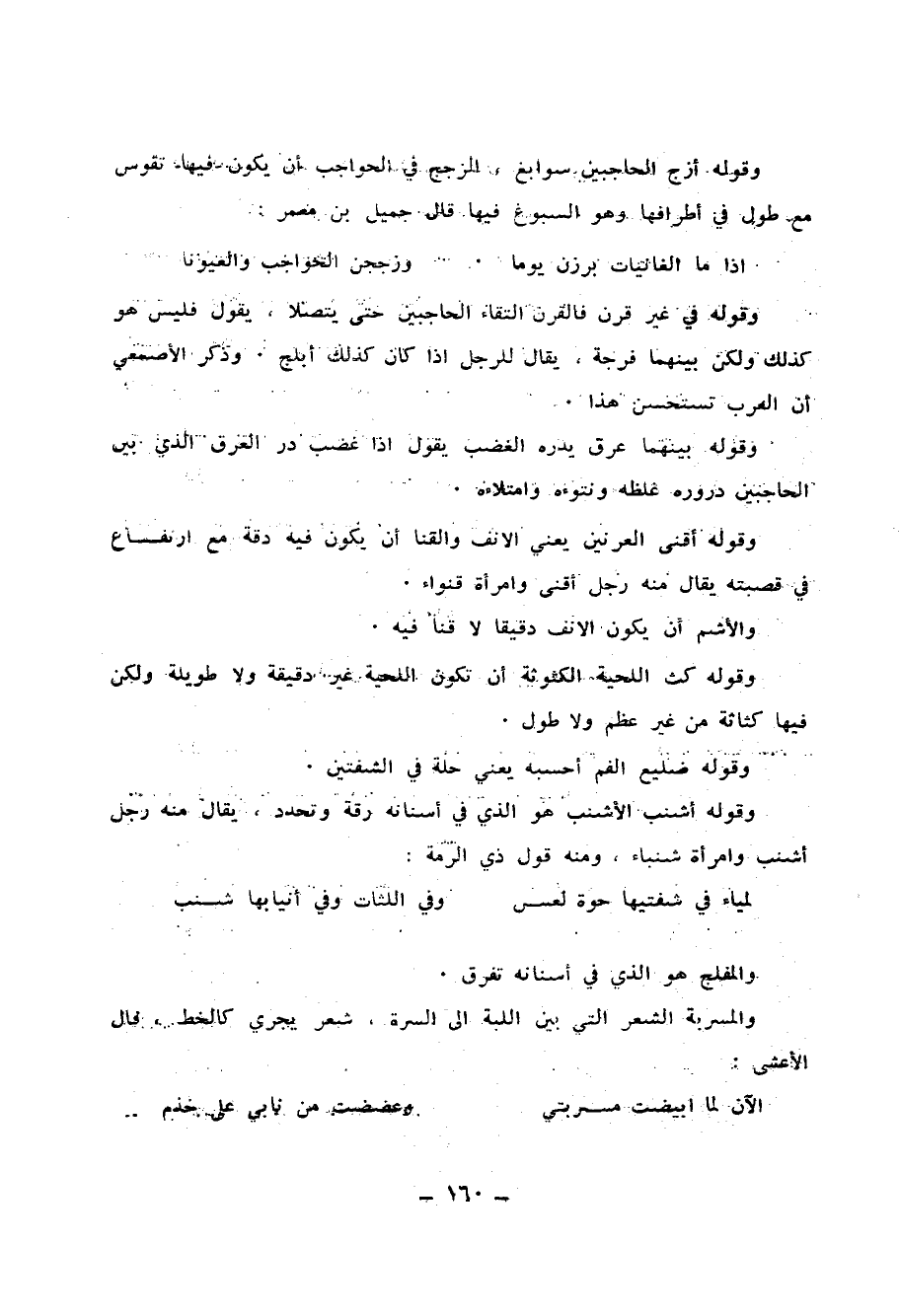 وَقَوْلُهُ: فِي غَيْرِ قَرَنٍ فَالْقَرَنُ الْتِقَاءُ الْحَاجِبَيْنِ حَتَّى يَتَّصَلَا يَقُولُ: فَلَيْسَ هُوَ كَذَلِكَ وَلَكِنْ بَيْنَهُمَا فُرْجَةٌ، يُقَالُ لِلرَّجُلِ إِذَا كَانَ كَذَلِكَ: أَبْلَجَ، وَذَكَرَ الْأَصْمَعِيُّ أَنَّ الْعَرَبَ تَسْتَحْسِنُ هَذَا، وَقَوْلُهُ: بَيْنَهُمَا عِرْقٌ يَدُرُّهُ الْغَضَبُ يَقُولُ إِذَا غَضِبَ دَرَّ الْعِرْقُ الَّذِي بَيْنَ الْحَاجِبَيْنِ دُرُورَهُ غِلَظَهُ وَنُتُوءَهُ وَامْتِلَاءَهُ وَقَوْلَهُ: أَقْنَى الْعِرْنِينَ: يَعْنِي الْأَنْفَ وَالْقَنَا أَنْ يَكُونَ فِيهِ دِقَّةٌ مَعَ ارْتِفَاعٍ فِي قَصَبَتِهِ يُقَالُ مِنْهُ رَجُلٌ أَقْنَى وَامْرَأَةٌ قَنْوَاءَ وَالْأَشَمُّ أَنْ يَكُونَ الْأَنْفُ دَقِيقًا لَا قَنَا فِيهِ وَقَوْلُهُ: كَثُّ اللِّحْيَةِ: الْكُثُوثَةُ أَنْ تَكُونَ اللِّحْيَةُ غَيْرَ دَقِيقَةٍ وَلَا طَوِيلَةٍ وَلَكِنْ فِيهَا كَثَافَةٌ مِنْ غَيْرِ عِظَمٍ وَلَا طُولٍ وَقَوْلُهُ: ضَلِيعُ الْفَمِ أَحْسَبُهُ يَعْنِي حُلَّةً فِي الشَّفَتَيْنِ، وَقَوْلُهُ: أَشْنَبُ: الْأَشْنَبُ هُوَ الَّذِي فِي أَسْنَانِهِ رِقَّةٌ وتَحَدُّدٌ يُقَالُ مِنْهُ رَجُلٌ أَشْنَبُ وَامْرَأَةٌ شَنْبَاءُ وَمِنْهُ قَوْلُ ذِي الرُّمَّةِ: